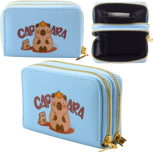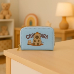 Ce portefeuille bleu clair allie un design ludique avec une capybara et une organisation pratique. Deux fermetures éclair dorées séparent l’espace de rangement pour répartir facilement cartes, espèces, pièces et reçus. La structure intérieure en accordéon offre un aperçu rapide et un accès confortable.