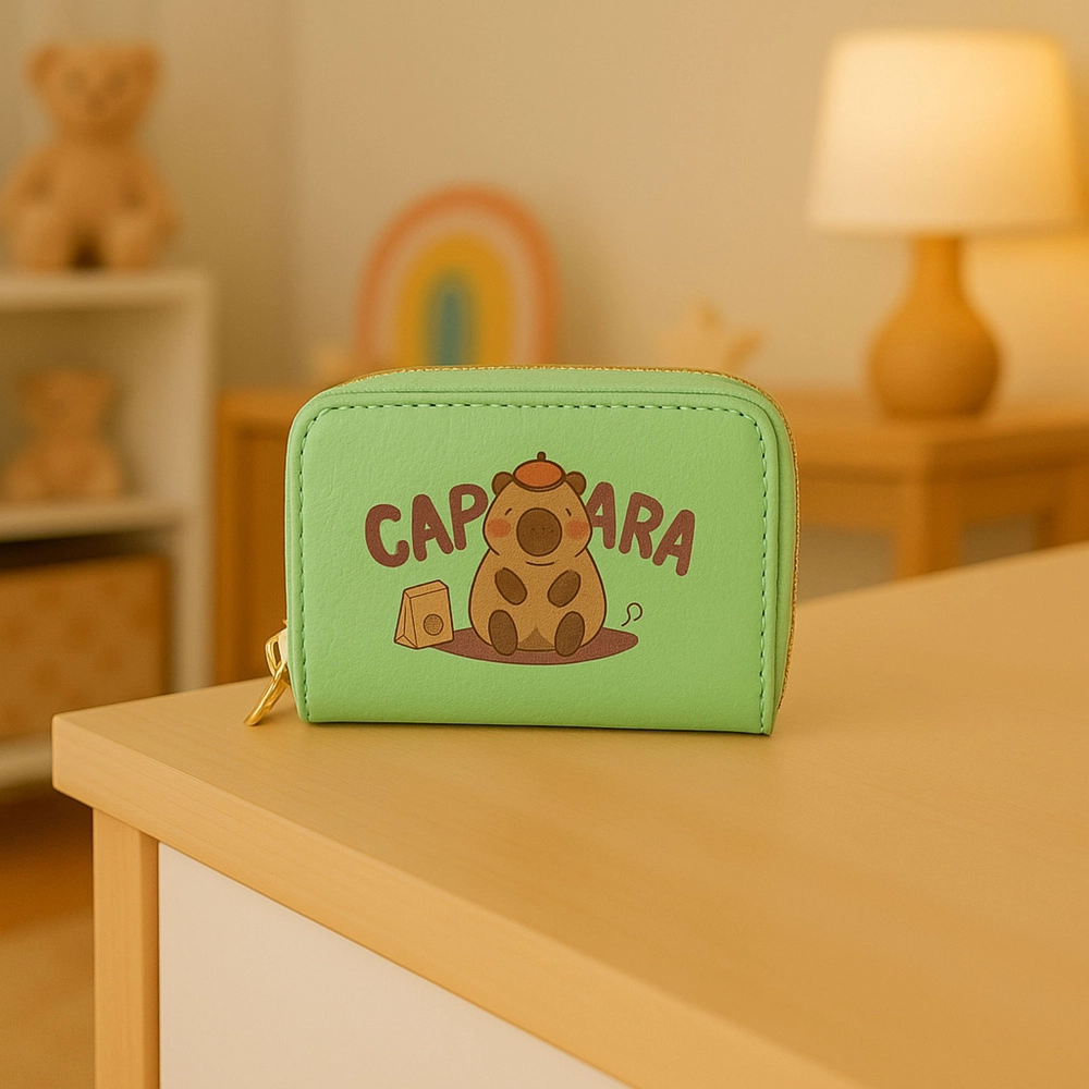 Ce portefeuille compact vert avec un adorable motif de capybara offre deux compartiments zippés séparés et une structure intérieure en accordéon pour un rangement clair des cartes, billets et pièces. Son matériau résistant à texture cuir, ses fermetures éclair dorées et ses dimensions pratiques en font un accessoire idéal pour enfants, ados et adultes.