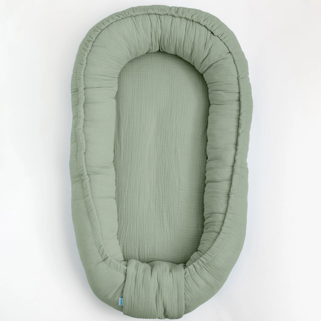 Le cocon en mousseline pour bébé New Baby, dans une élégante teinte sauge, est fabriqué à partir d’un fil de coton exceptionnellement doux. Il offre à bébé un environnement cosy et délimité qui favorise le sentiment de sécurité et un sommeil paisible. Sa structure légère permet de le transporter facilement où vous voulez – dans le lit bébé, sur le canapé, au sol ou dans la poussette.