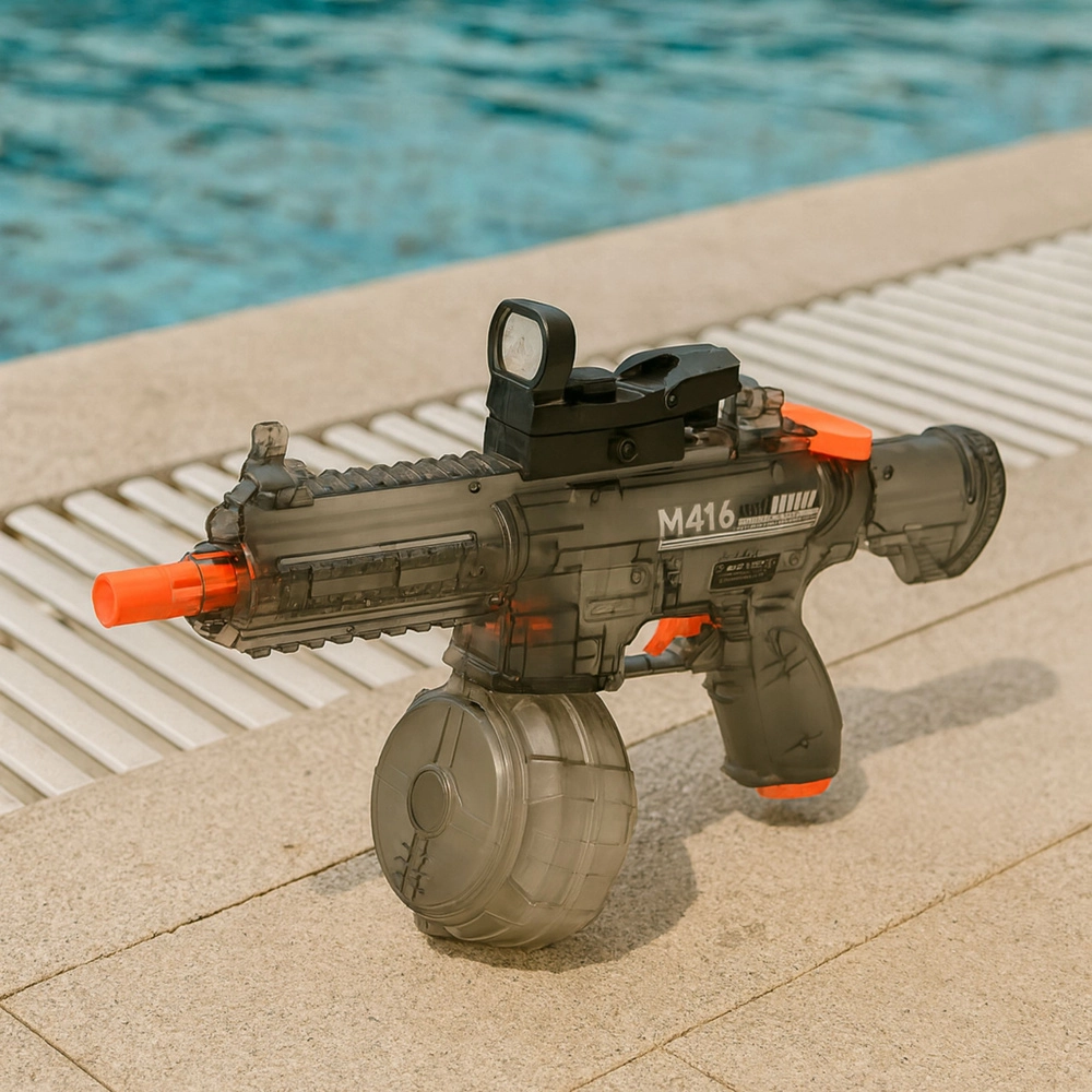 Le pistolet à eau électrique M416 est idéal pour les batailles en plein air à la piscine, au jardin ou à la plage. Sa poignée ergonomique, son entraînement automatique et son grand chargeur tambour offrent des performances stables sans pompage manuel constant. Le corps transparent avec éléments de sécurité orange affiche un look moderne et les LED à l’extrémité du canon ajoutent une touche dynamique à l’action.