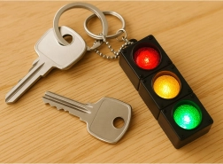 Porte-clés amusant en forme de mini feu tricolore avec trois LED qui changent de couleur et offrent un effet de clignotement. Idéal comme outil éducatif pour les enfants, gadget original et porte-clés pratique pour clés, sac à dos ou trousse. Léger, robuste et facile à utiliser avec un seul bouton, alimenté par des piles incluses.