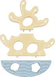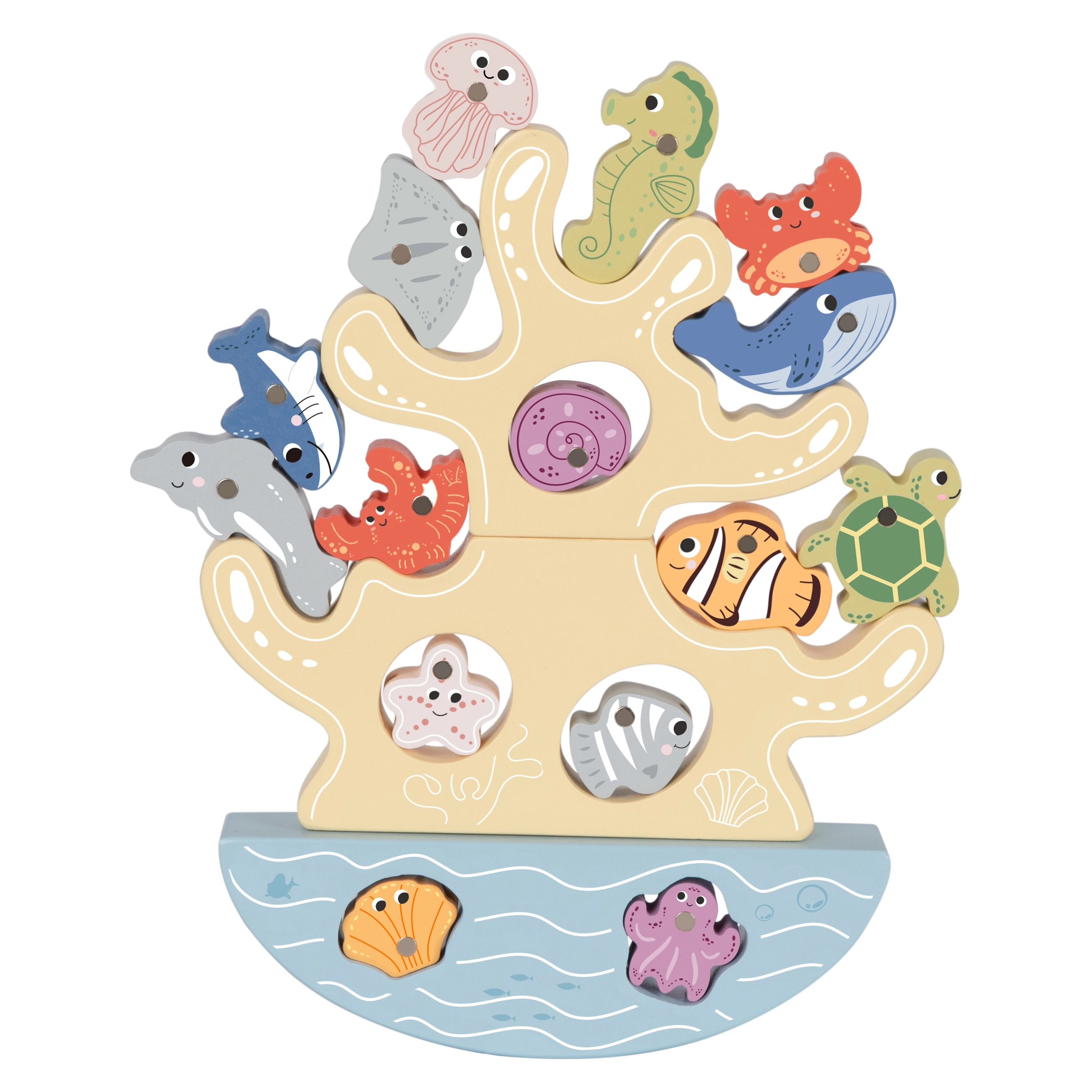 Une tour corallienne sur une base oscillante invite à empiler et équilibrer. Elle développe la motricité fine, la logique et la perception spatiale de façon ludique.