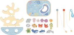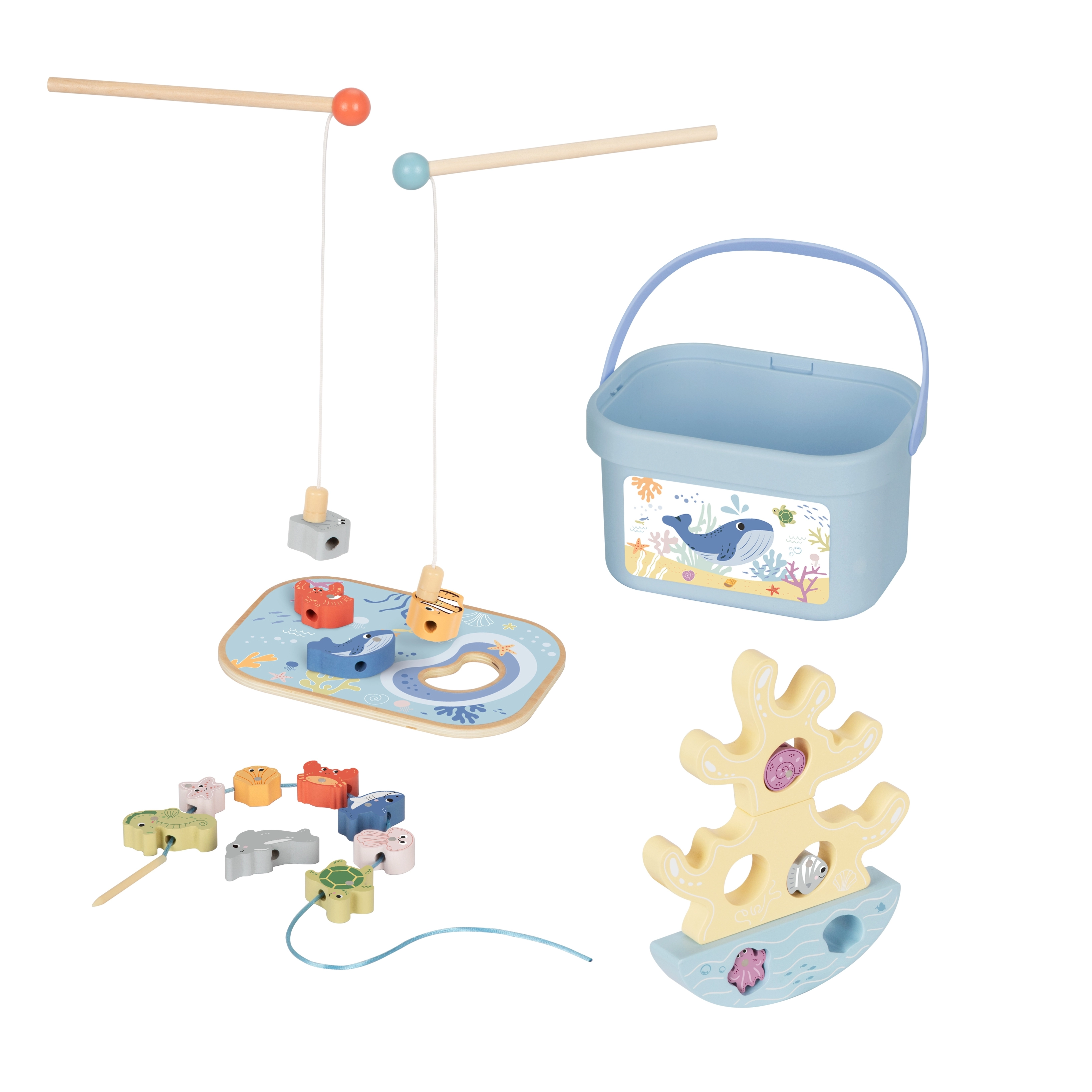 Ce set créatif en bois offre aux enfants tout un océan d’amusement dans un seul coffret. Deux cannes magnétiques invitent à attraper des poissons colorés, la tour d’équilibre corallienne entraîne patience et stabilité, et la corde à enfiler avec aiguille en bois développe motricité fine et concentration. Les pièces ont des bords agréablement arrondis et tiennent bien dans les petites mains.