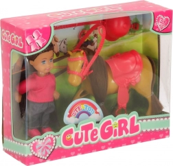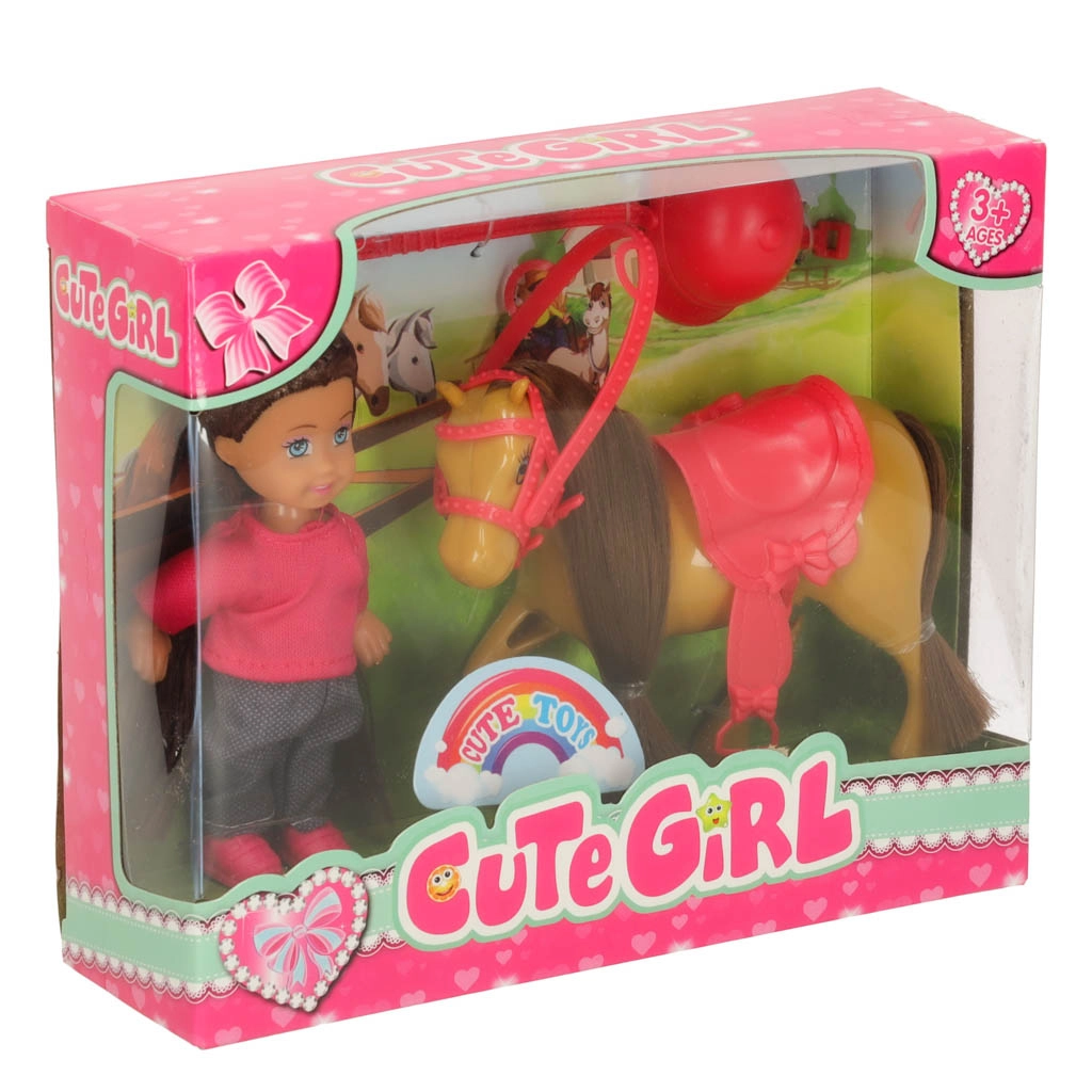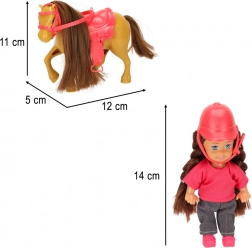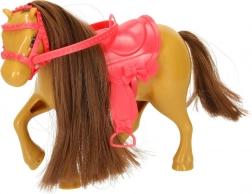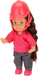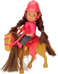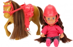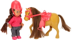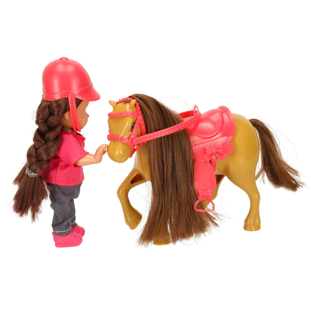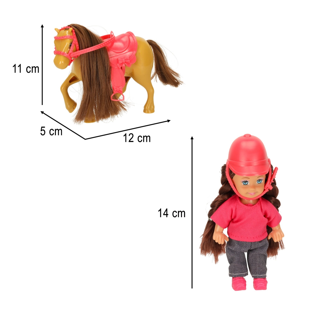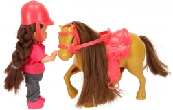 L’ensemble est assorti dans des tons marron–rose et comprend 5 pièces dont des accessoires amovibles. La poupée a les bras et jambes articulés pour s’asseoir facilement en selle, et les deux figurines ont de longs cheveux adaptés au coiffage.