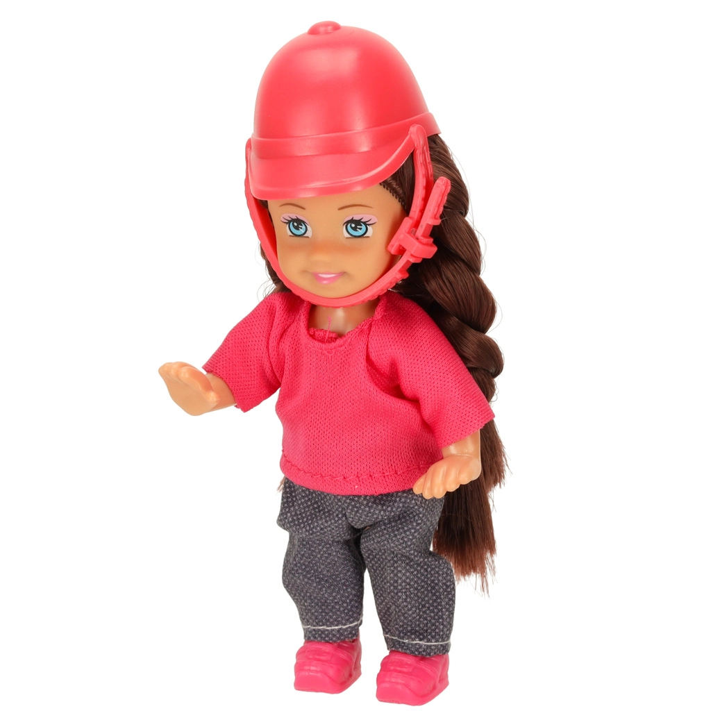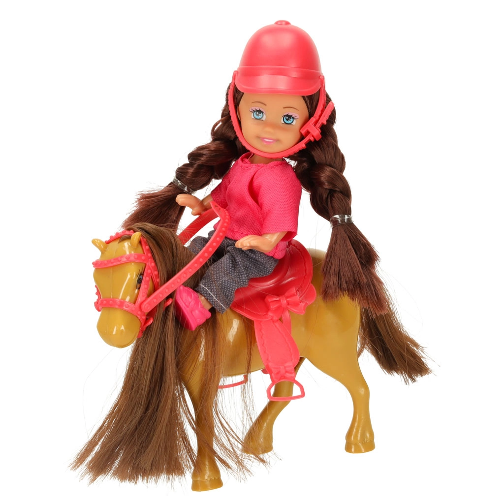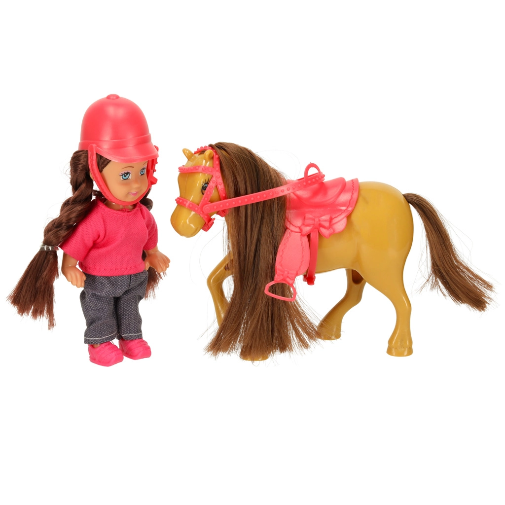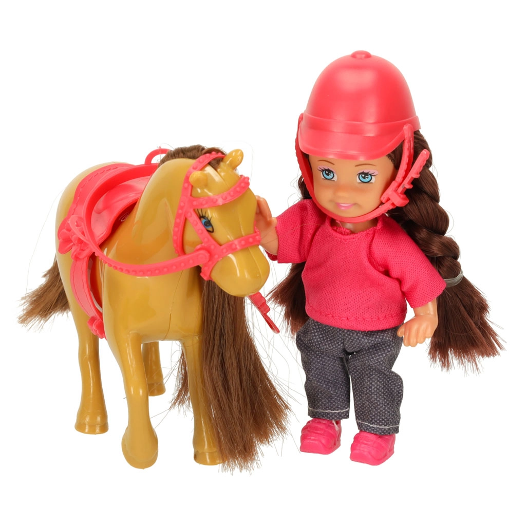 Le poney a une selle et un bridon, la poupée un casque d’équitation — tout est amovible pour faciliter l’habillage et le jeu de scénarios.