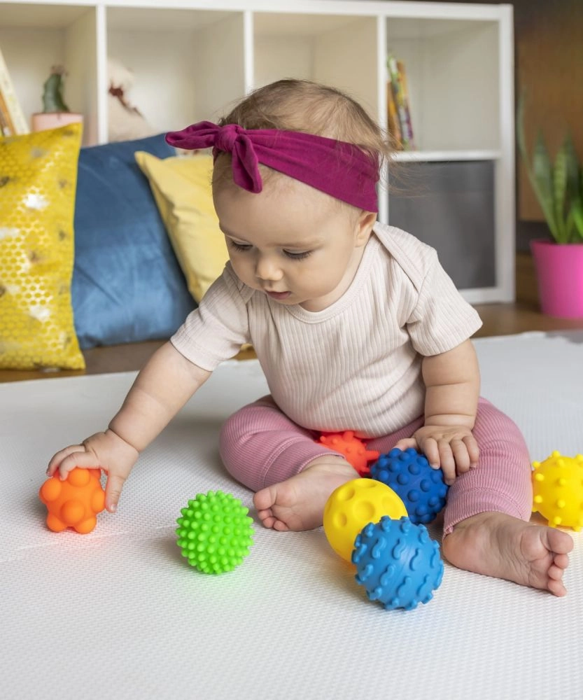 Les balles sensorielles TULLO, aux couleurs vives, encouragent les enfants à saisir, presser et lancer. Leurs textures variées (picots, stries, bosses) offrent de riches stimuli tactiles et aident à renforcer la prise ainsi que la coordination œil–main. Grâce à leur matière souple et agréable, elles conviennent aux tout-petits dès la naissance.