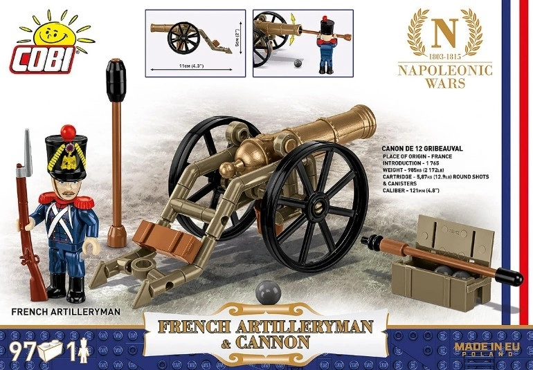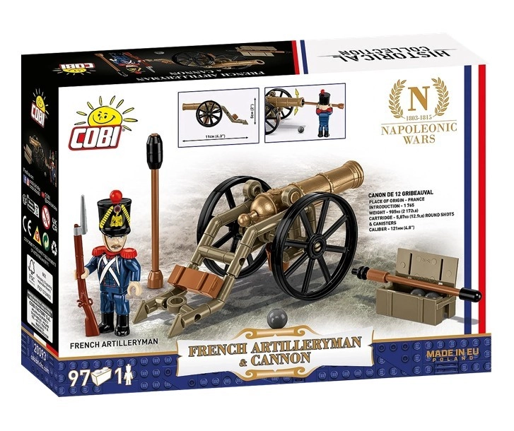 Découvrez la puissance de l’artillerie napoléonienne avec un modèle authentique de canon de 12 livres du système Gribeauval et une figurine d’artilleur français en uniforme bleu foncé. La boîte apporte des détails réalistes dont une baguette de nettoyage, des munitions et un coffre en bois, afin de créer aisément une scène historique fidèle.