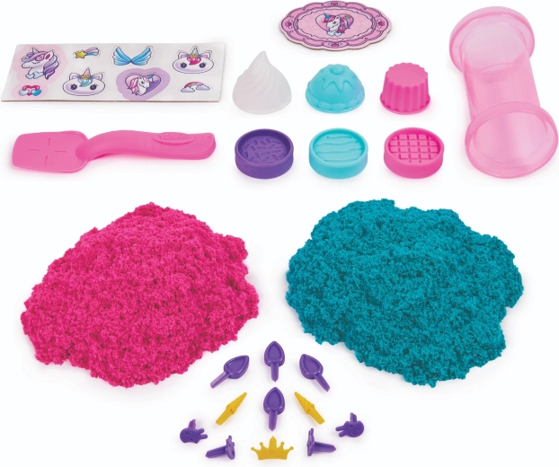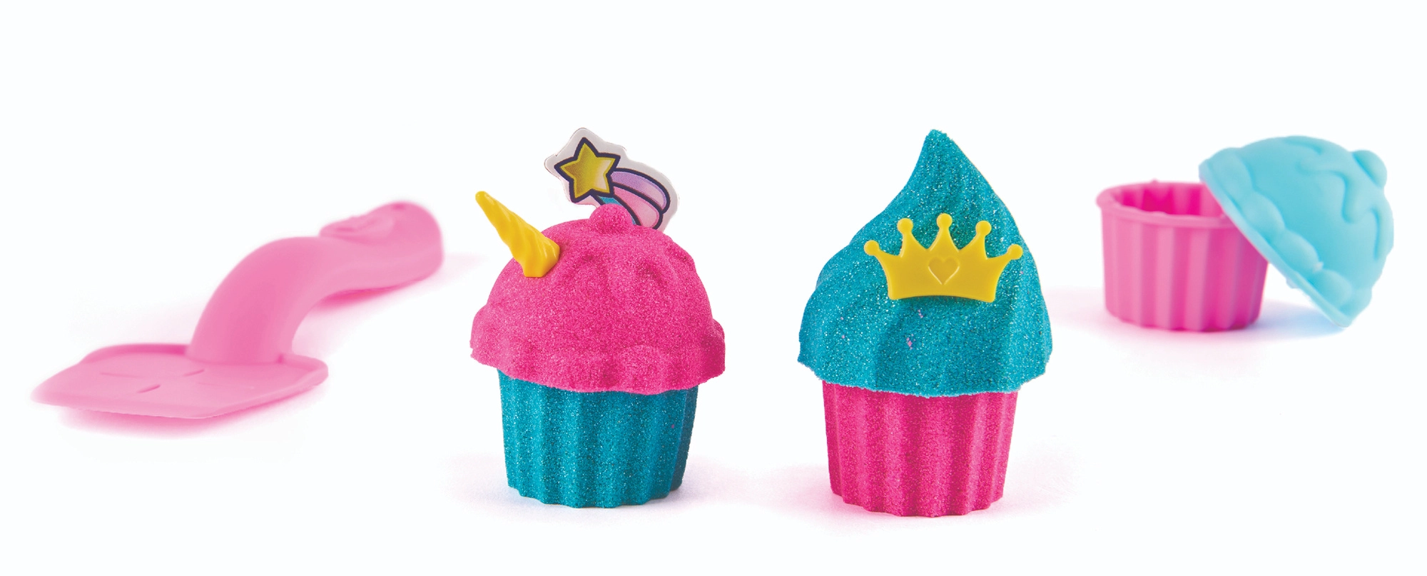 Pressez la pâte, formez des caissettes et décorez avec des ornements de licorne. Les deux couleurs de sable permettent de superposer la « pâte » et le « glaçage » comme dans une véritable pâtisserie.