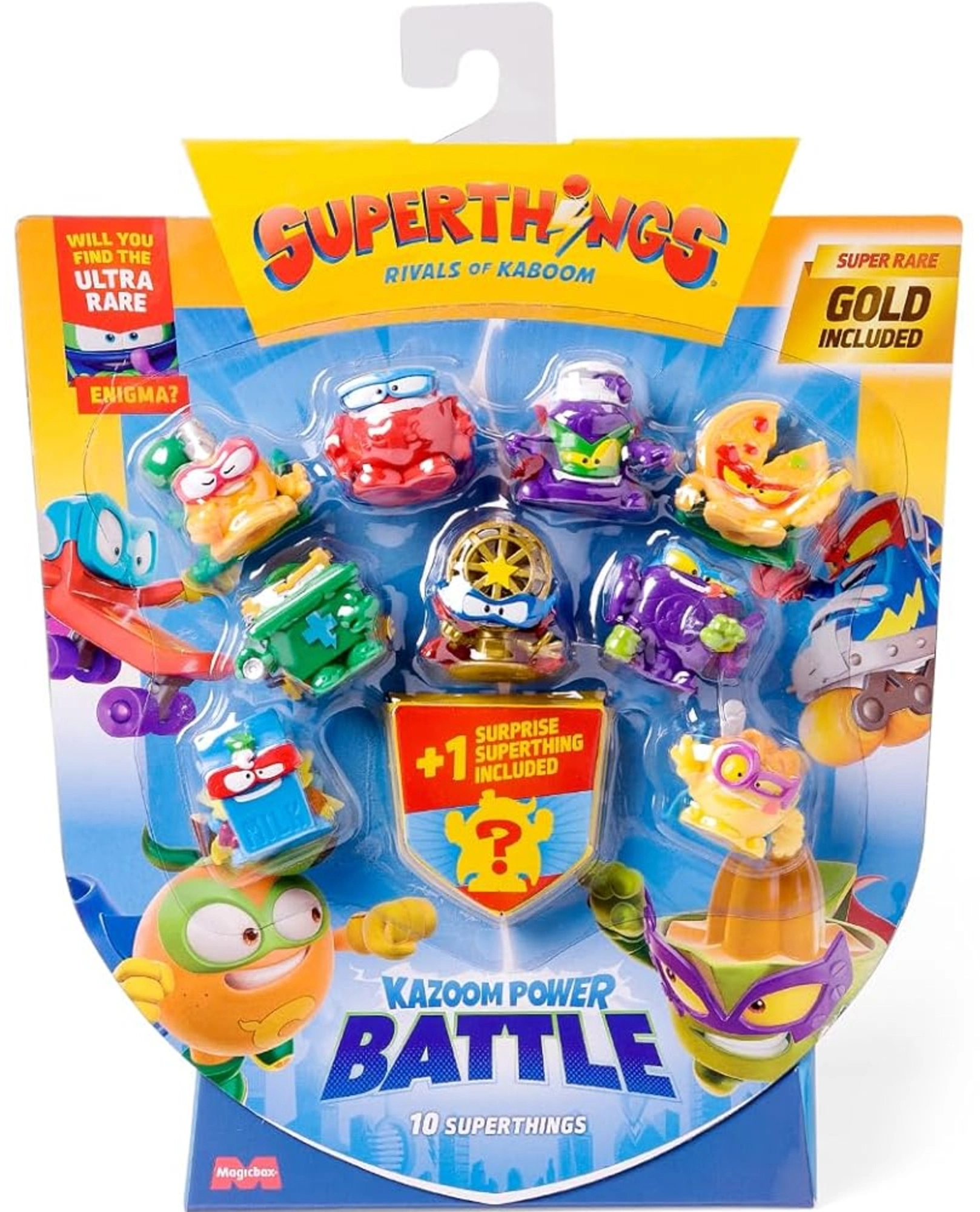 Le set SuperThings Kazoom Power Battle offre un amusement dynamique aux petits collectionneurs. La boîte contient 9 figurines différentes ainsi que 1 figurine mystère, qui peut être commune, rare ou ultra rare. La série compte plus de 80 personnages – parviendrez-vous à obtenir la figurine super rare Enigma ?
