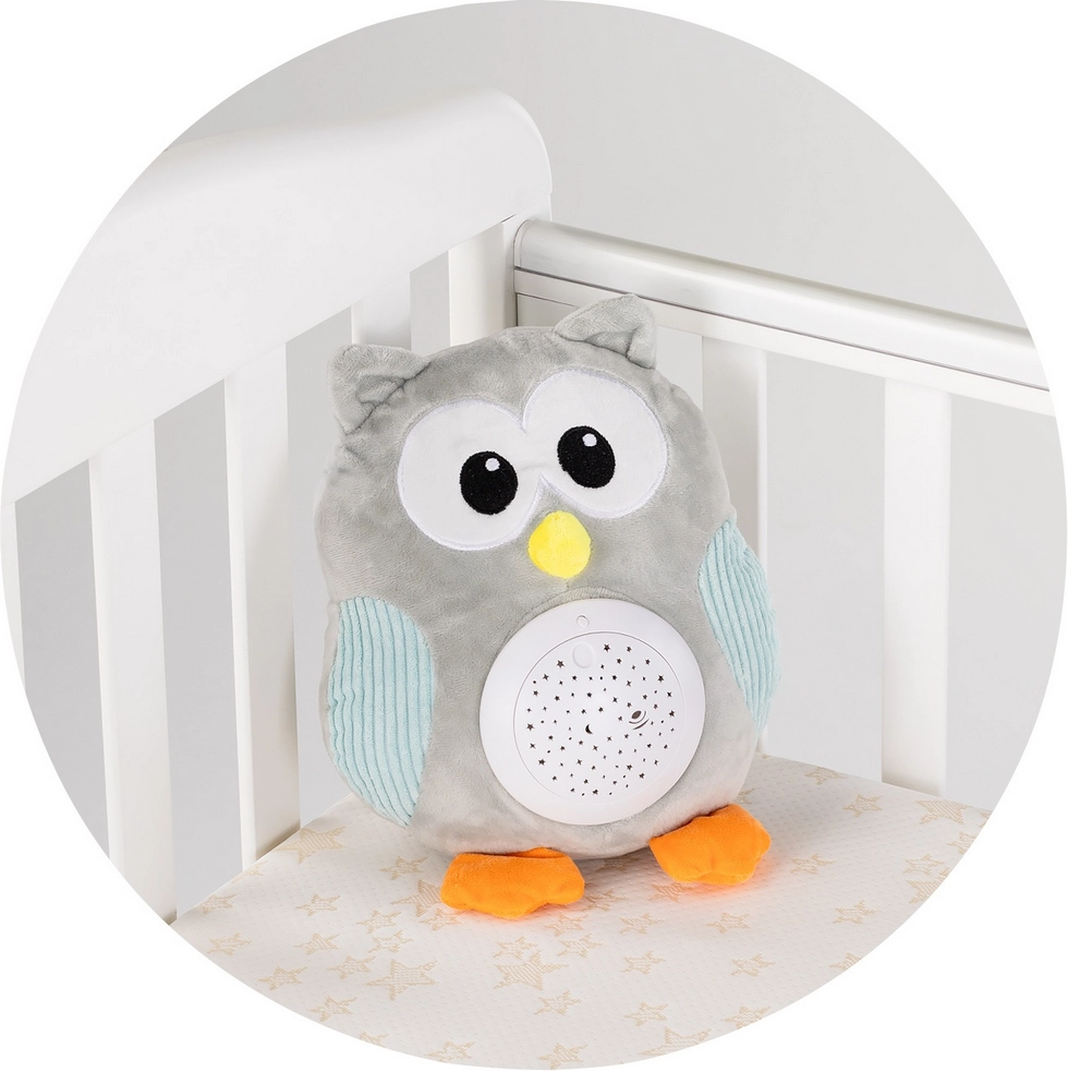 Grâce au boîtier musical amovible, vous pouvez laver facilement la partie en peluche à la main jusqu’à 30 °C. Fonctionne avec 3× piles AAA (non fournies), pour emporter la chouette partout — dans le lit, la poussette ou en voyage.