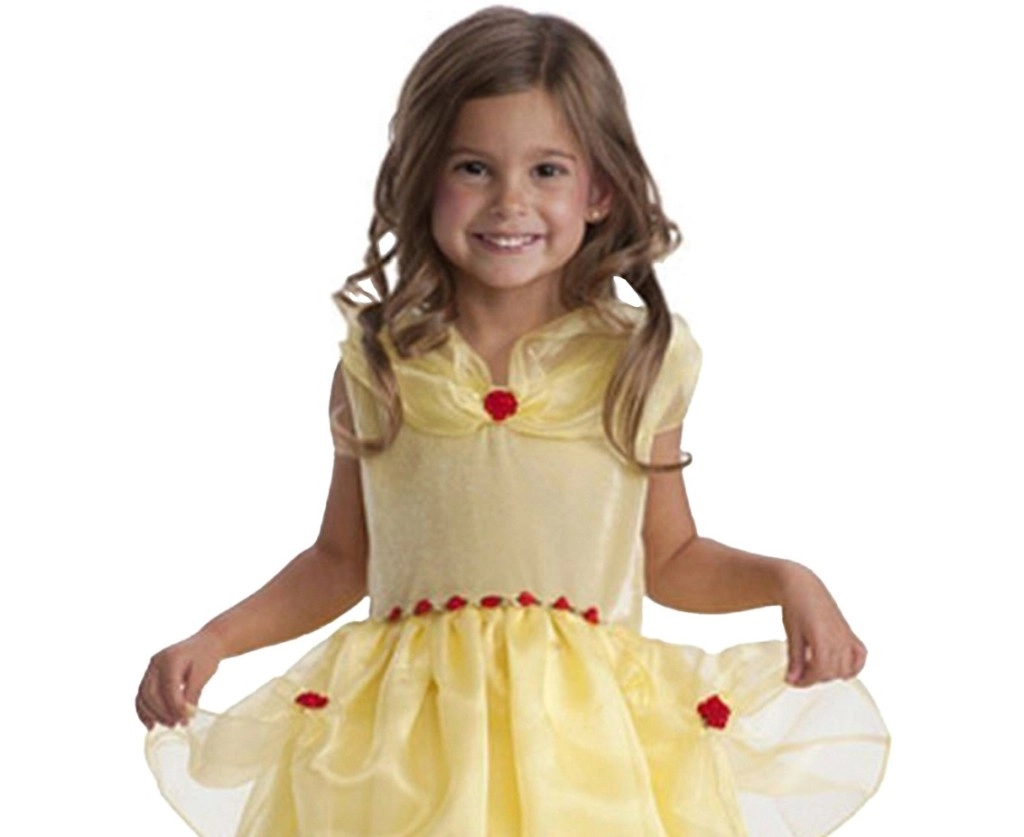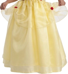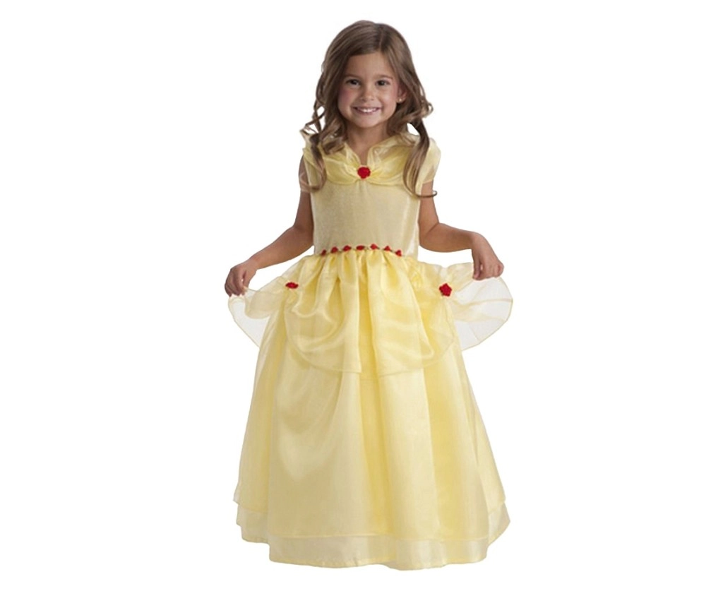 Une jupe jaune ample à plusieurs couches et des petites roses rouges décoratives créent un look charmant inspiré de Belle.
