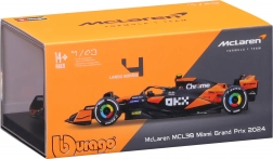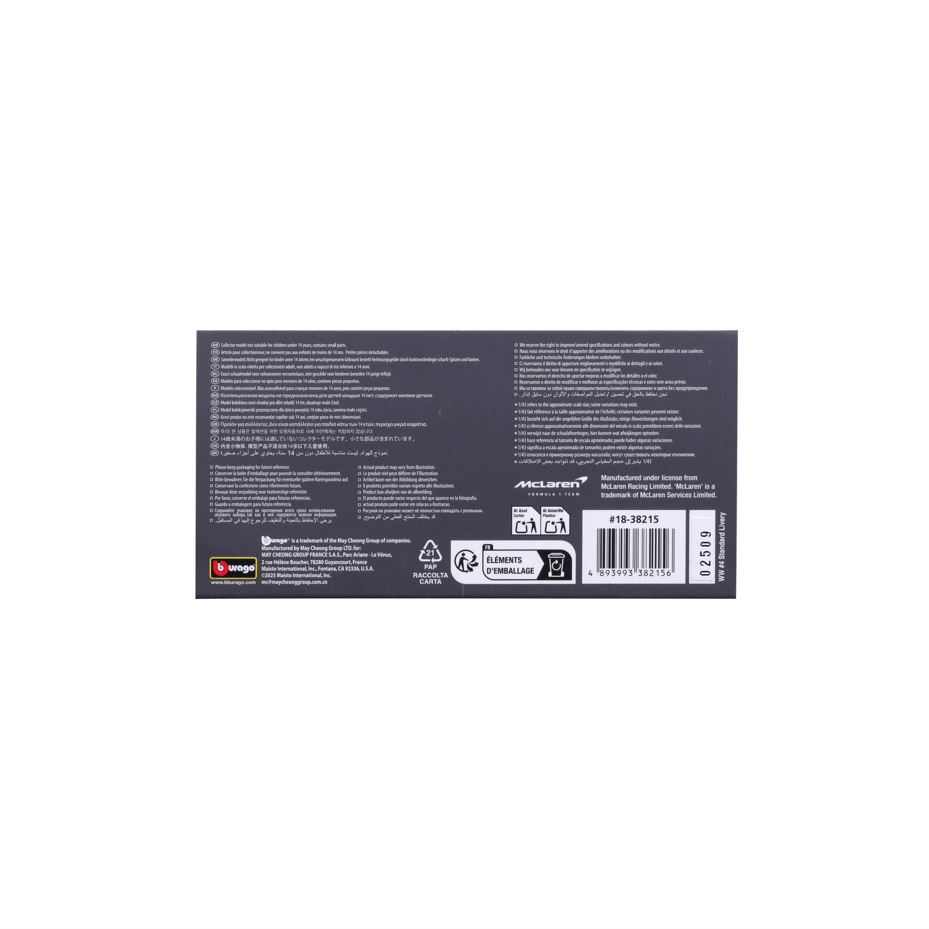 Modèle officiellement licencié McLaren MCL38 2024 à l’échelle 1:43 par Bburago, capturant la monoplace actuelle de Lando Norris avec sa célèbre livrée orange‑noire et les logos des sponsors. Grâce aux proportions exactes, aux formes aérodynamiques et au cockpit détaillé avec figurine de pilote, il est idéal pour une vitrine ou comme cadeau pour les fans de Formule 1.