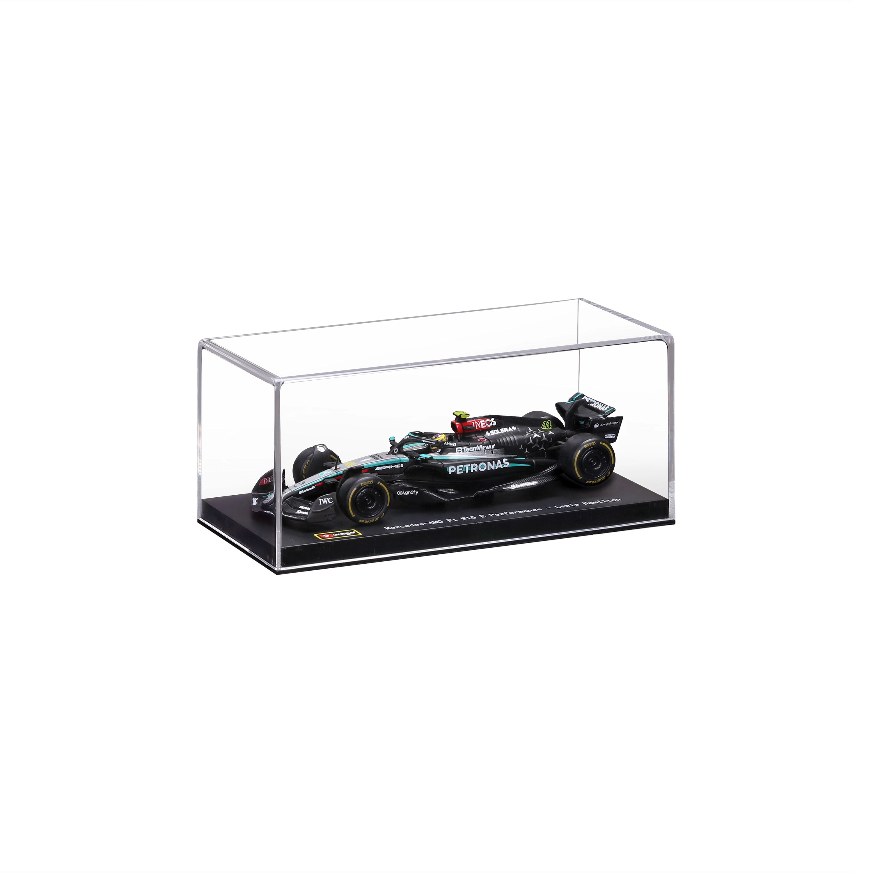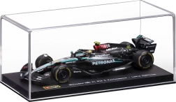 Le modèle est livré dans une vitrine acrylique avec socle, qui protège de la poussière et met en valeur la présentation. Grâce aux roues roulantes, vous l’arrangerez facilement dans une vitrine ou sur un bureau. Excellent cadeau pour les fans de LEWIS HAMILTON et de l’ère moderne de la F1.