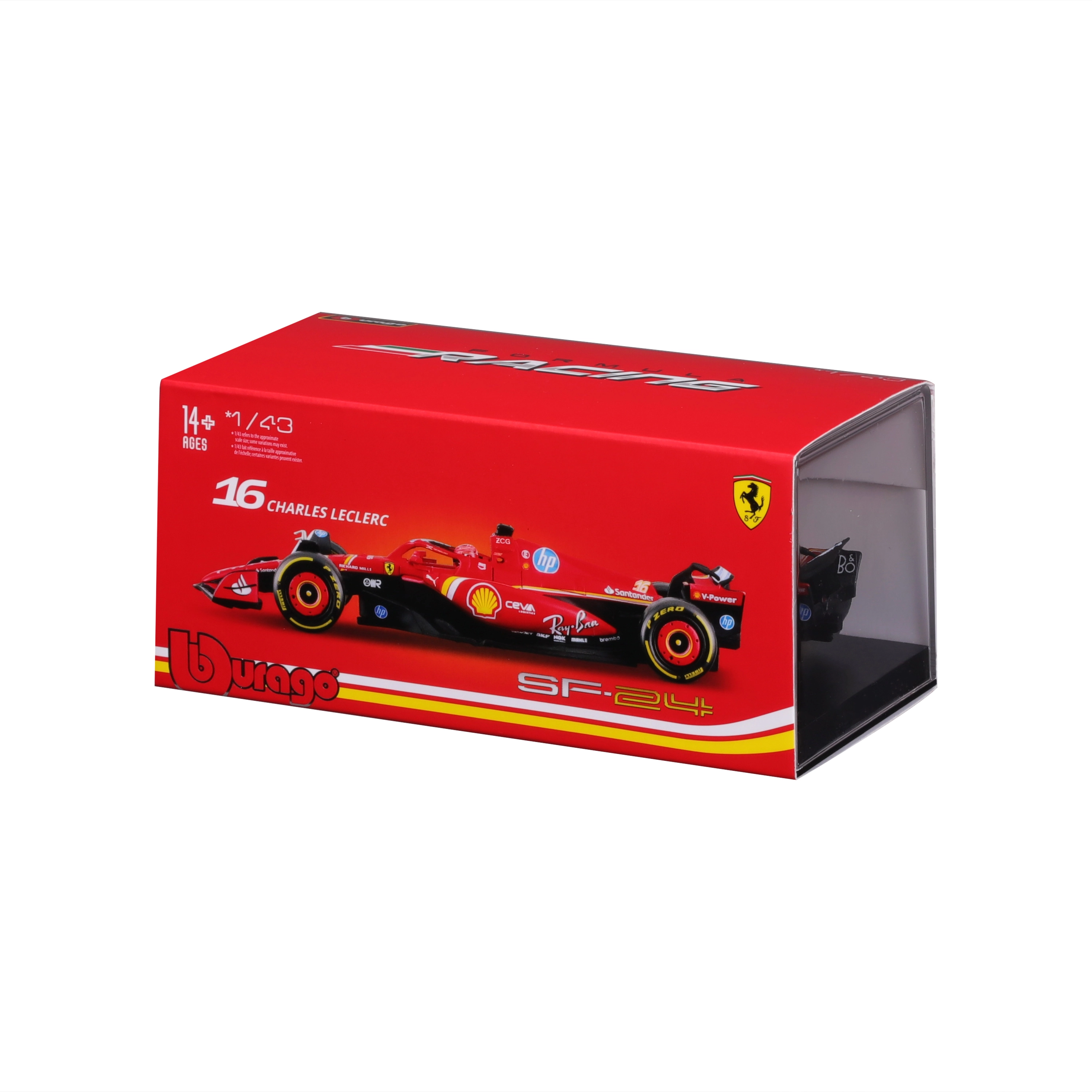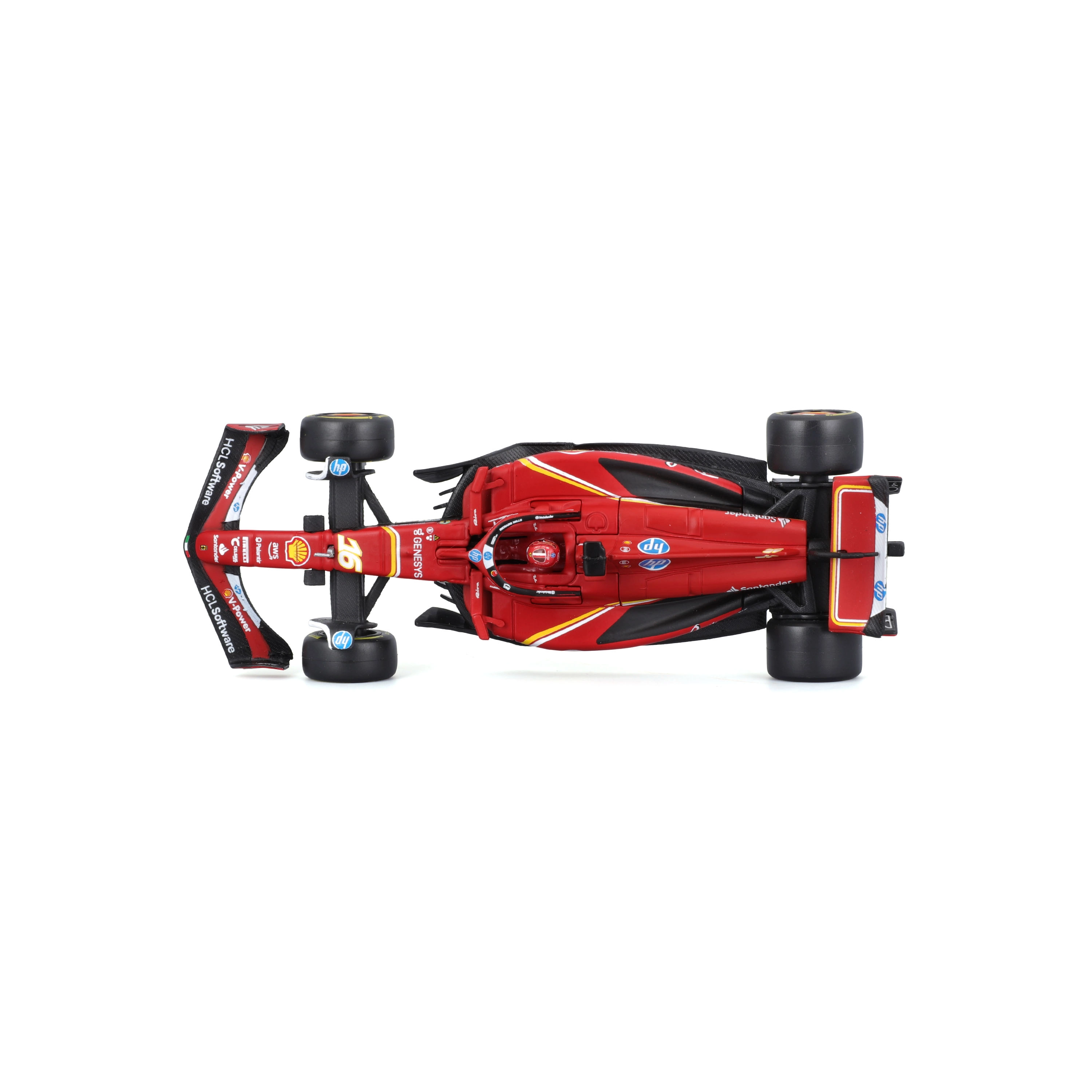 Ce modèle Ferrari SF-24 (2024) officiellement licencié par Bburago reproduit fidèlement les formes du monoplace, y compris les ailerons avant et arrière, le halo et la livrée de course avec logos des sponsors. L’échelle 1:43 est idéale pour les séries de collection et une exposition compacte.