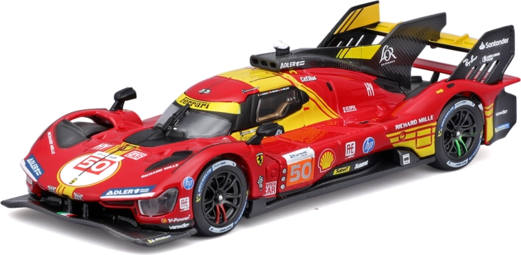 Le modèle présente des marquages de course fidèles, le numéro 50 et l’iconique rouge Ferrari avec accents jaunes – exactement comme la voiture a triomphé au Mans.