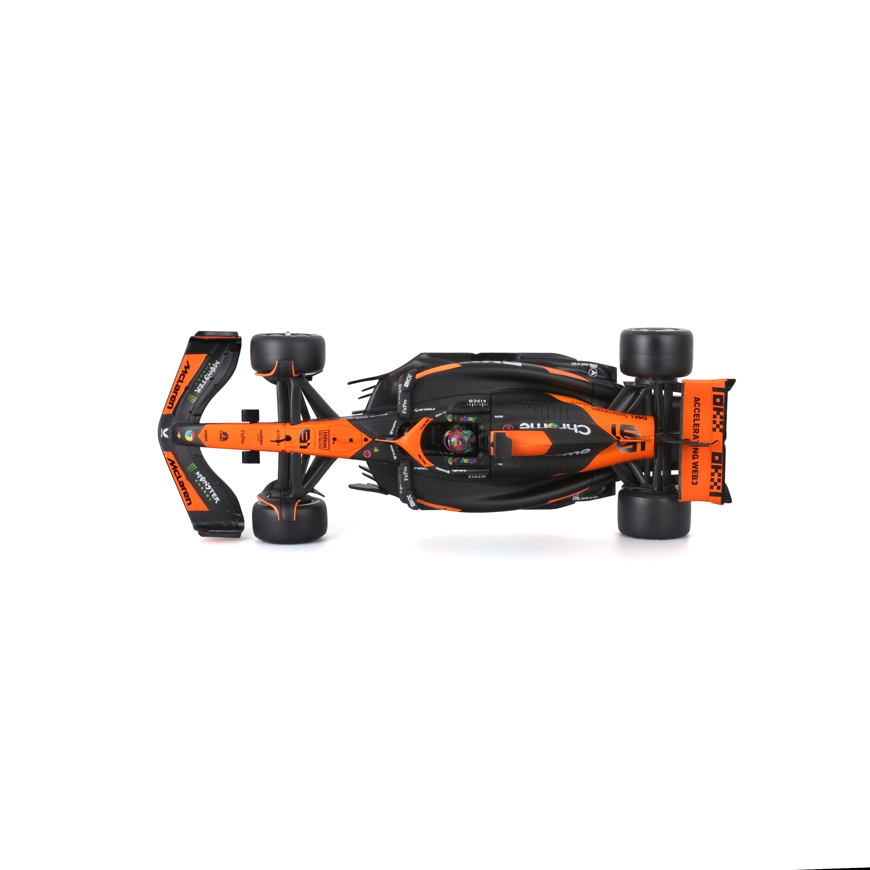 - Livrée officielle McLaren – combinaison orange et noir iconique.