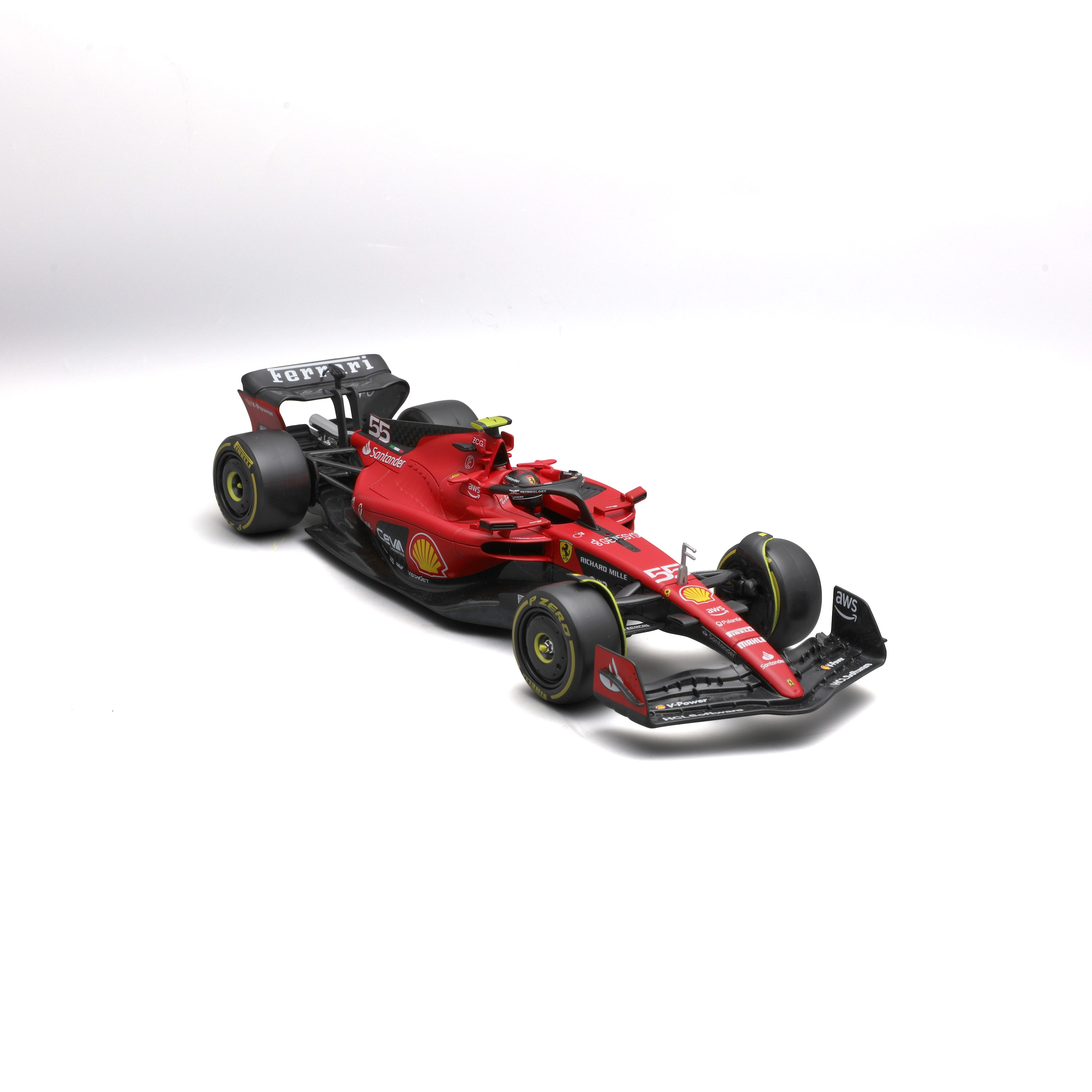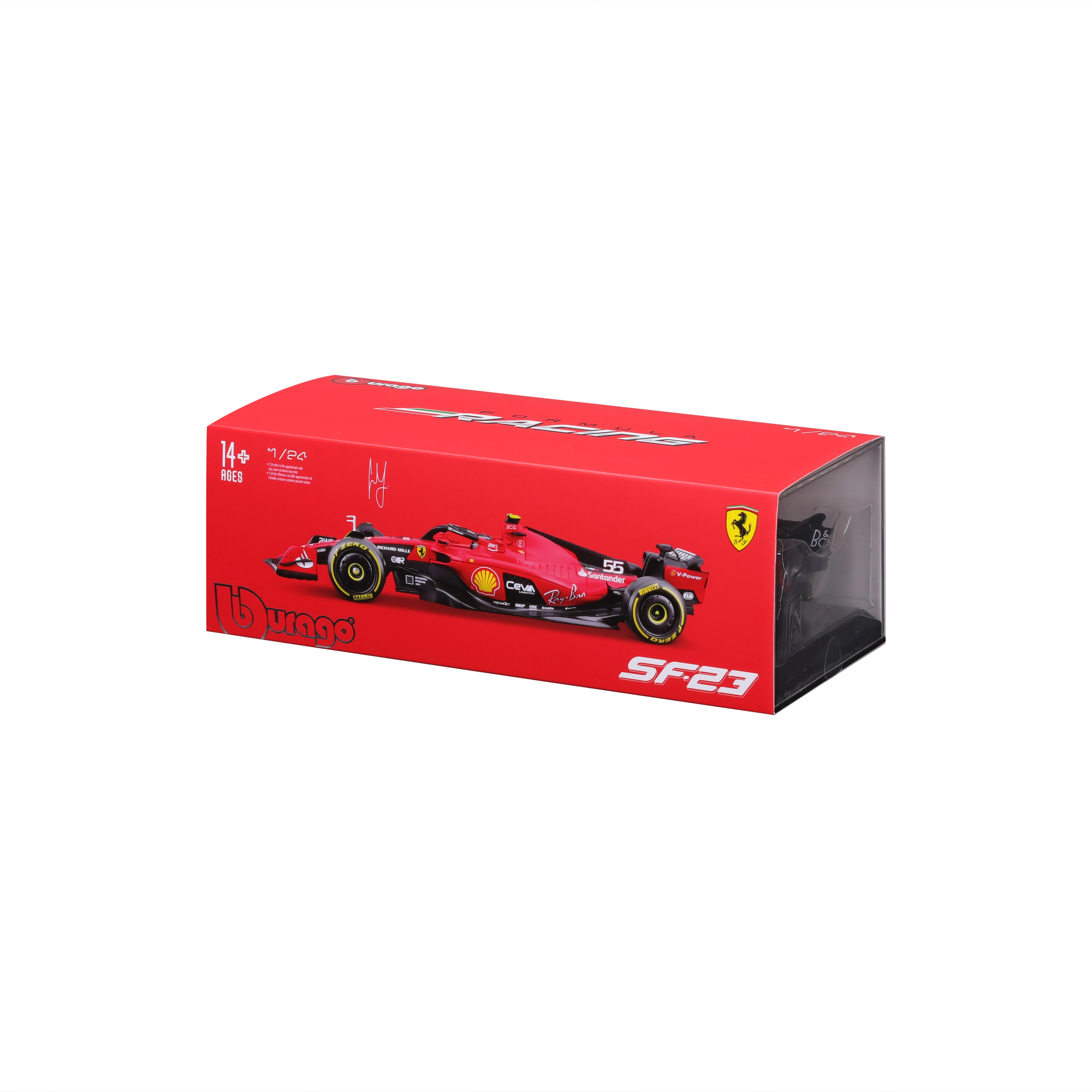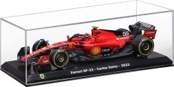 Le modèle est fabriqué avec un souci de proportions réalistes et de détails fins, incluant des pneus slick, une peinture de course et le numéro de départ 55 du pilote Carlos Sainz. Un boîtier de protection rigide (hard case) est inclus, protégeant de la poussière et facilitant l’exposition sur une étagère ou en vitrine.