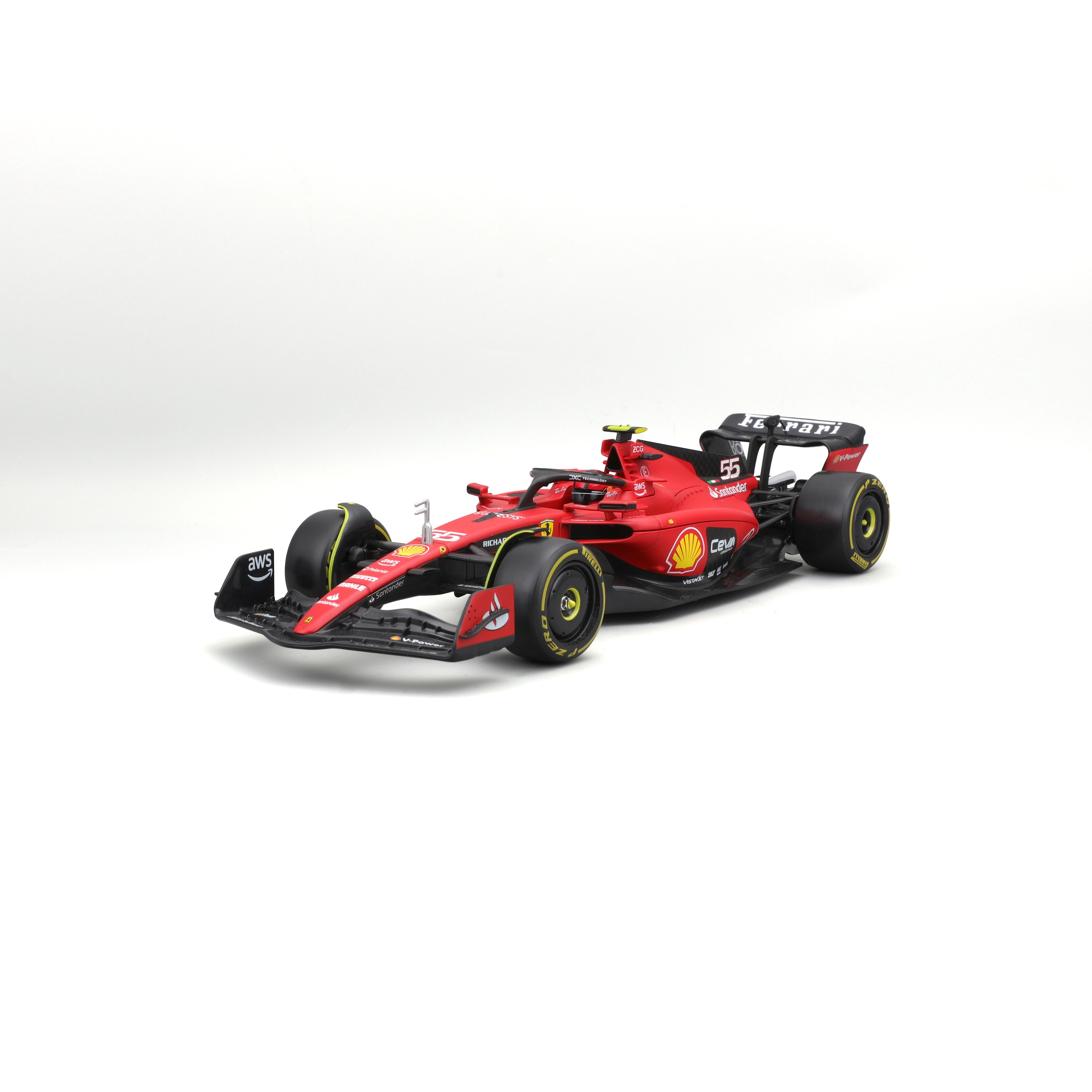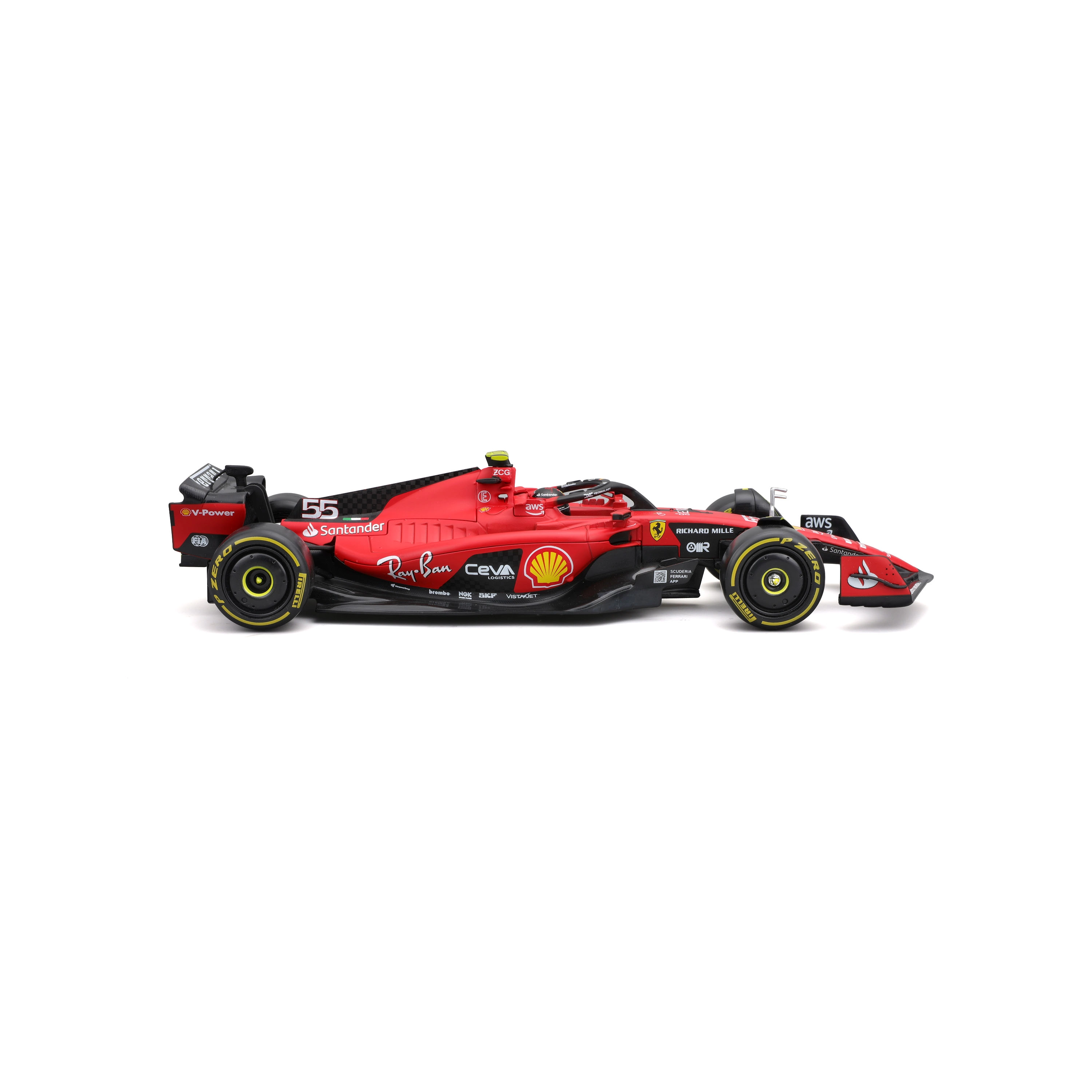 Éléments aérodynamiques précis, halo, ailerons et pneus slick réalistes avec marquages détaillés correspondent fidèlement au véritable monoplace FERRARI SF23.