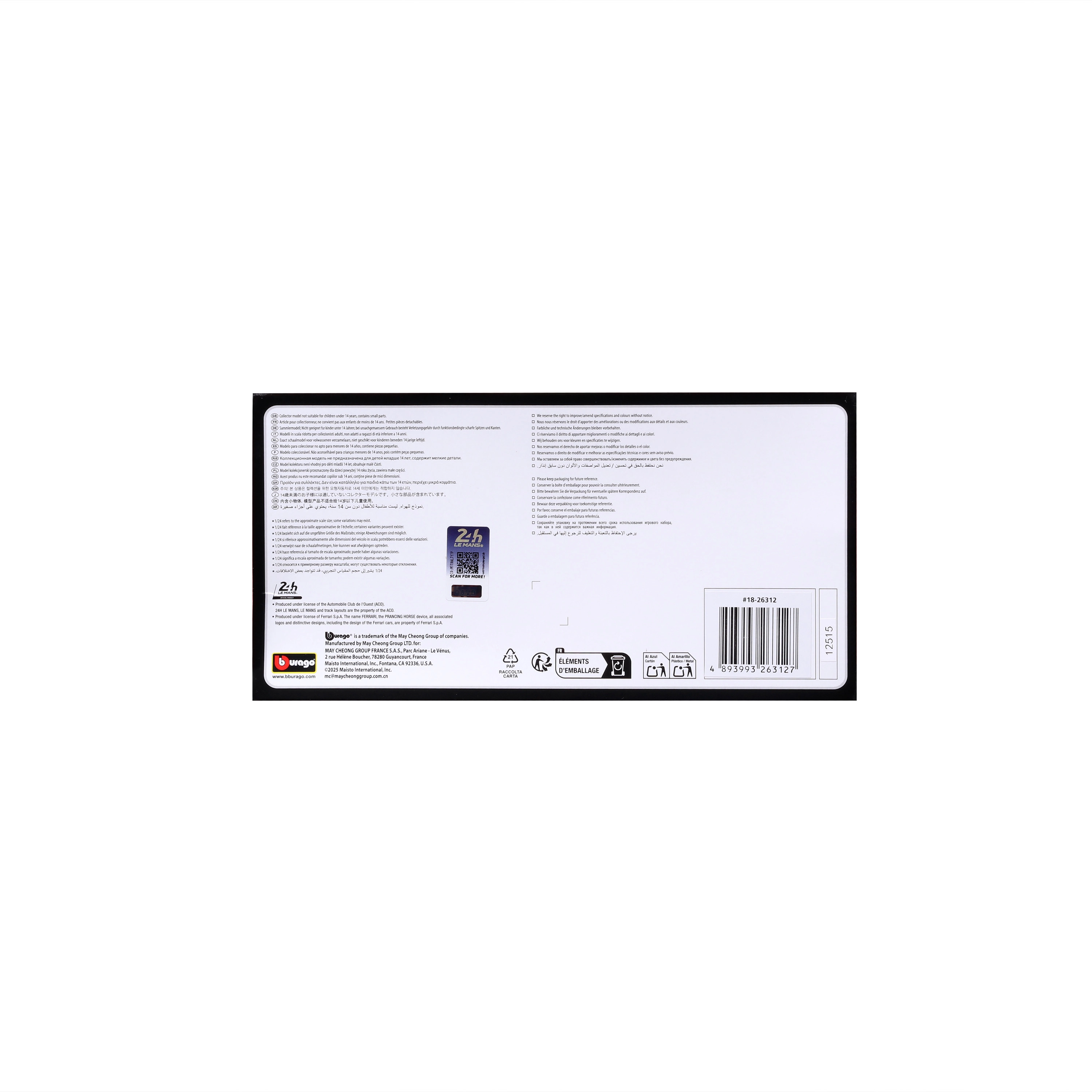 Ce modèle sous licence Ferrari 499P offre des proportions de course authentiques, des éléments aérodynamiques fidèles et des marquages sponsors de qualité. Grâce à la combinaison de métal et de pièces plastiques finement moulées, il paraît extrêmement réaliste et complétera à merveille toute collection.
