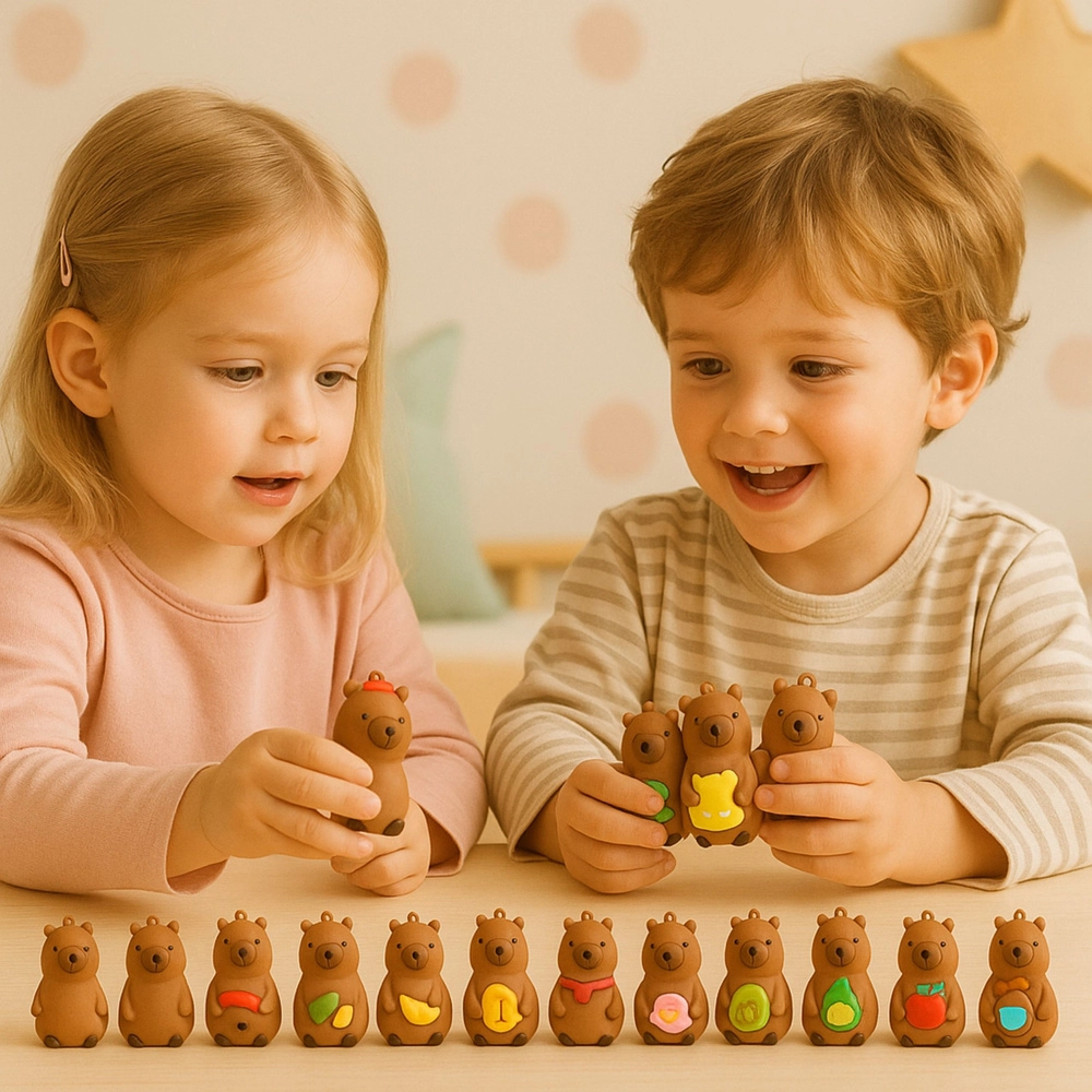 Chaque boîte cache une capybara aléatoire en porte-clés et des cartes. Le déballage est plein de suspense et encourage l’échange et la collection.