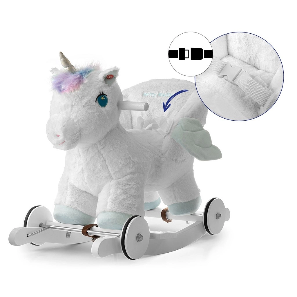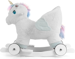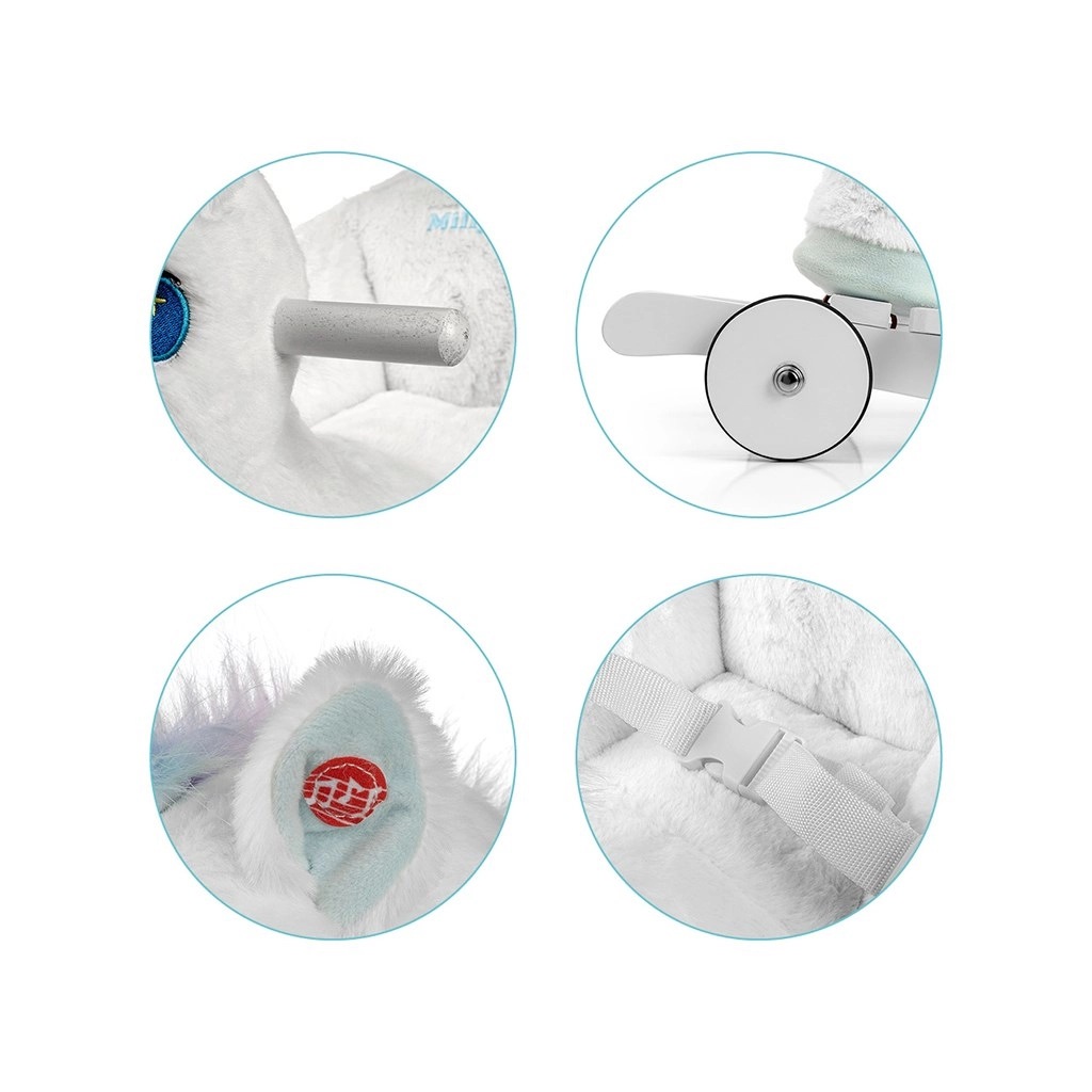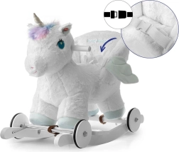 En quelques secondes, passez du mode bascule au mode roulant : les roulettes escamotables transforment la licorne en un adorable petit véhicule pour un usage intérieur. Les oreilles interactives diffusent, lorsqu’on appuie dessus, des bruits de galop et des hennissements joyeux, stimulant ainsi les sens. Jouer avec la licorne à bascule aide à développer la coordination motrice, l’imagination et le sens de l’équilibre.