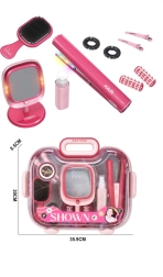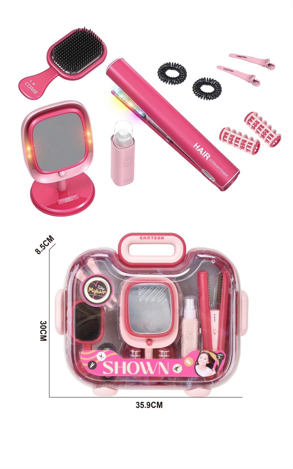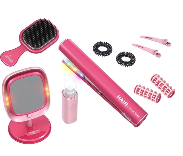 - Contenu du set : lisseur pour enfants (lumière et son), miroir de table LED avec socle, brosse à cheveux, 2× pince (types variés), 2× bigoudi, 2× élastique, valisette portable