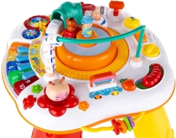 La table offre un équipement riche : piano coloré avec 3 modes, petit train avec ourson à différentes vitesses, engrenages, volant avec petite voiture, chenille coulissante avec phrases parlées, bouton de signal du train, klaxon ainsi que des perles et anneaux multicolores. Les pieds se démontent facilement pour un jeu compact au sol.