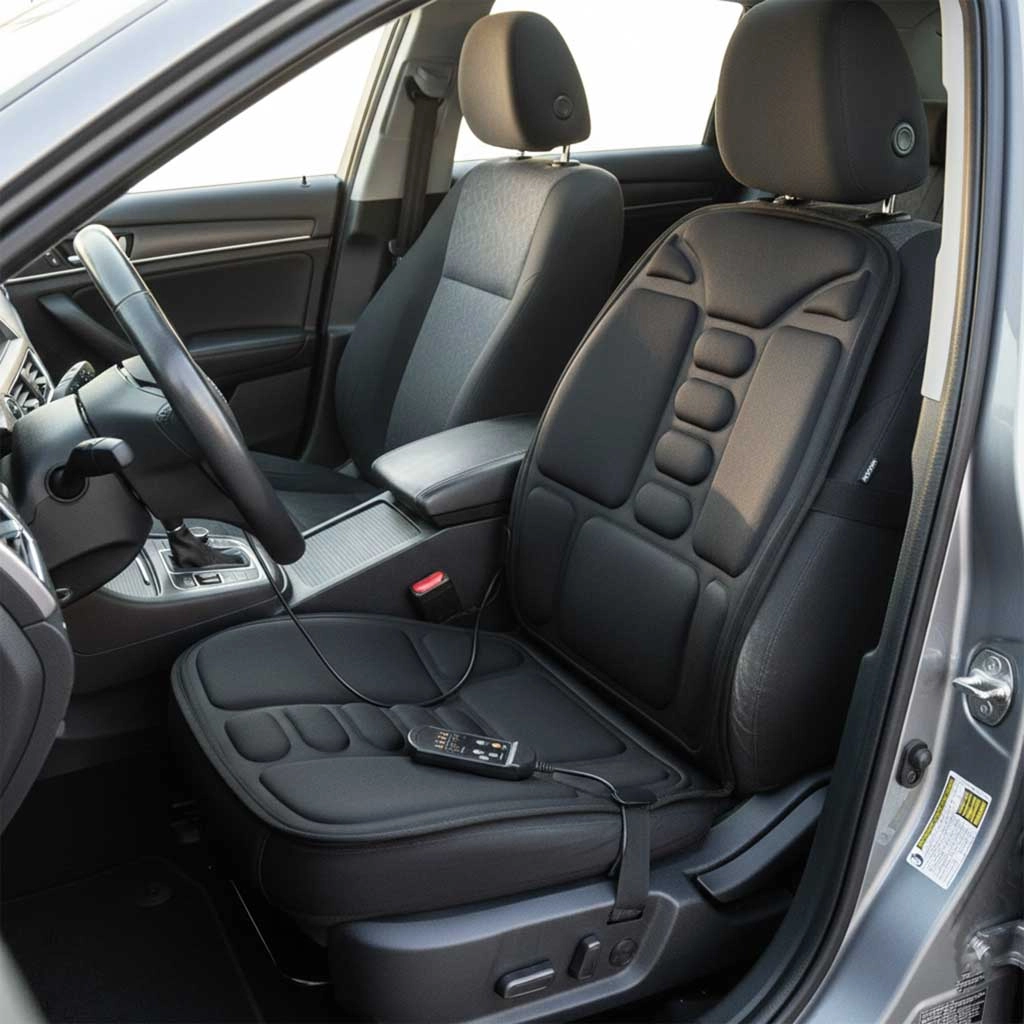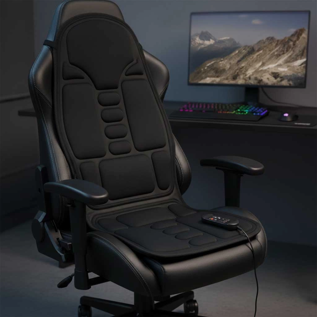 Ce sur-siège massant confortable offre un massage vibrant ciblé du dos et des cuisses et, grâce au chauffage intégré, favorise la détente musculaire. La fixation simple par sangles élastiques assure une bonne stabilité sur une chaise de bureau, un fauteuil gaming ou un siège automobile.