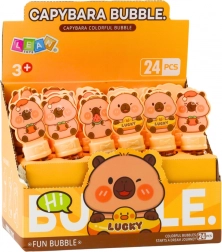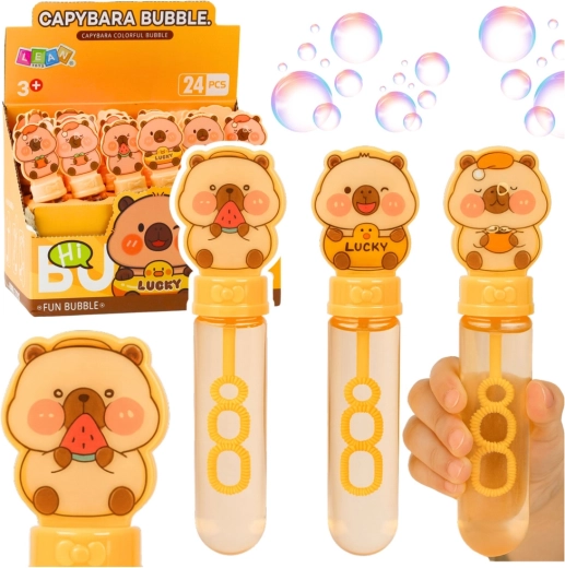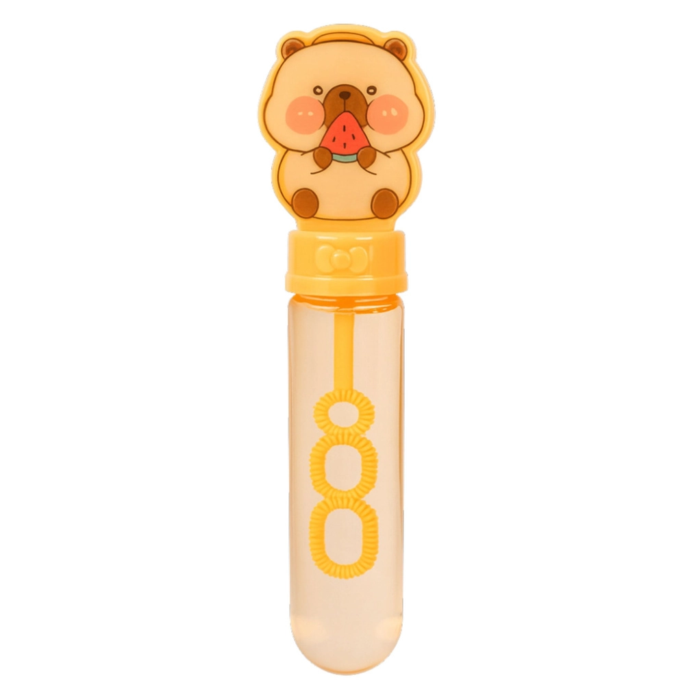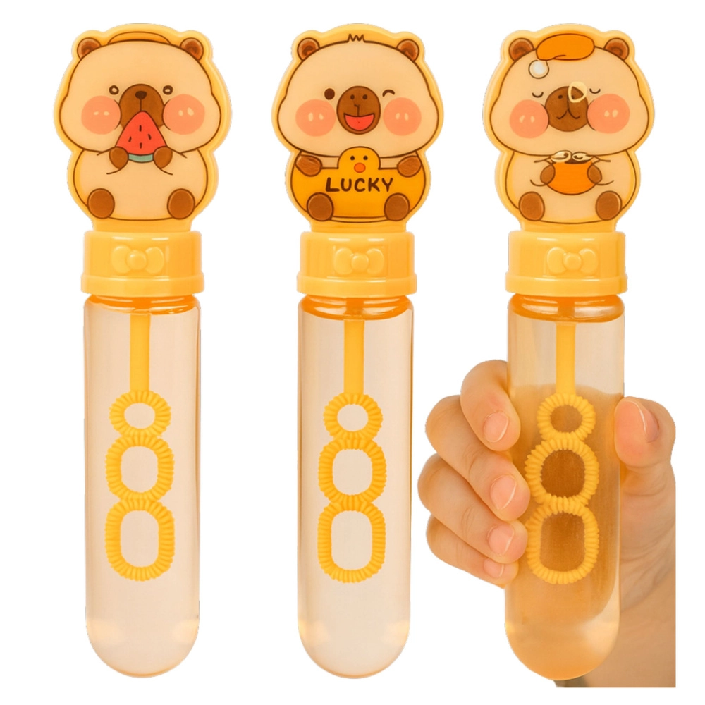 Un bouchon en forme de capybara attire l’attention des enfants et fait de ce jeu de bulles un accessoire apprécié au parc comme en fête.