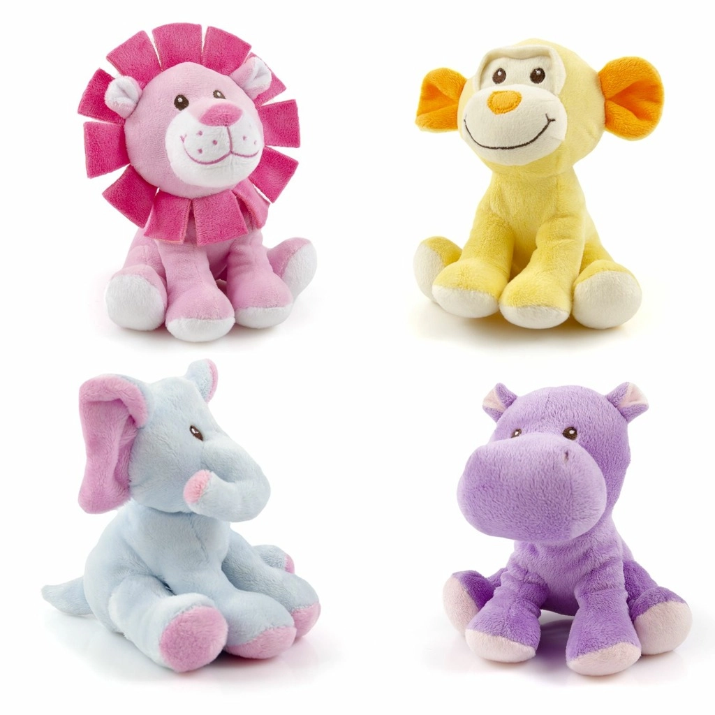 - Quatre variantes colorées : lion rose, éléphant bleu, petit singe jaune, hippopotame violet.