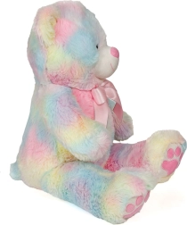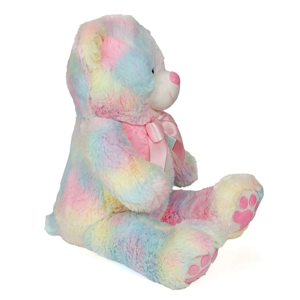 Ce nounours tout doux aux couleurs de l’arc-en-ciel arbore une expression craquante et un élégant nœud rose qui souligne son style ludique. Grâce à sa hauteur généreuse de 60 cm, il deviendra un compagnon préféré pour les câlins, la lecture et l’endormissement. Sa surface soyeuse est agréable au toucher et convient aux peaux sensibles des enfants.