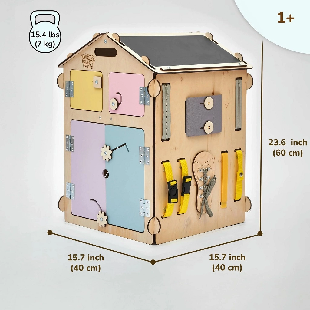 La maison d’activités pastel BusyKids est un outil Montessori bien pensé pour les tout-petits et les enfants d’âge préscolaire. Les enfants y jouent, s’y cachent et s’entraînent naturellement à la coordination œil–main, à la concentration et à la patience. Le toit cache un tableau pour dessiner et un puzzle à encastrer, tandis que les parois invitent à explorer des fermetures éclair, du scratch, une lampe tactile, un réveil, des éléments de motricité, des boutons, des fenêtres et une porte. Ouvrir, fermer et faire entrer ou sortir des jouets est un vrai plaisir pour les enfants.