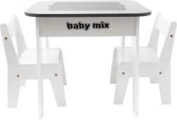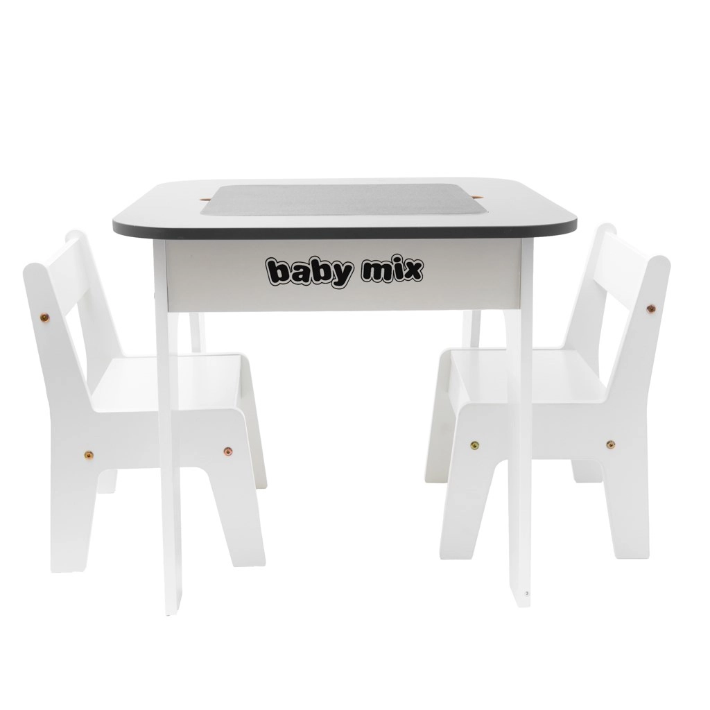 L’ensemble table pour enfants et deux chaises BABY MIX Leaf Grey est conçu pour un maximum de confort et d’ordre pendant le jeu et les activités créatives. Le plateau de table amovible dissimule un espace de rangement pratique pour crayons, papier, petits jouets ou briques de construction – tout est toujours à portée de main et la surface de travail reste dégagée.
