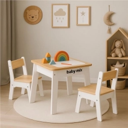 Le set de mobilier pour enfants BABY MIX Leaf Natural est conçu pour un usage quotidien – du dessin aux constructions jusqu’au jeu libre. Des matériaux résistants et des détails bien pensés garantissent stabilité, confort et sécurité. Grâce au plateau amovible de la table avec espace de rangement pratique, les enfants ont toujours crayons, papiers et petits jouets à portée de main.