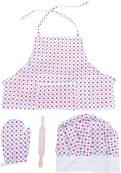 - tablier, toque de chef, manique, rouleau en bois, emporte-pièces en métal