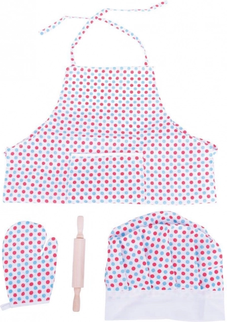 Offrez aux petits chefs tout ce dont ils ont besoin pour leurs premières pâtisseries et pour des jeux de cuisine amusants. Le tablier à pois en tissu léger protège les vêtements, la toque de chef s’ajuste facilement grâce au velcro et le rouleau en bois avec des emporte-pièces en métal stimule la créativité et le plaisir de créer.