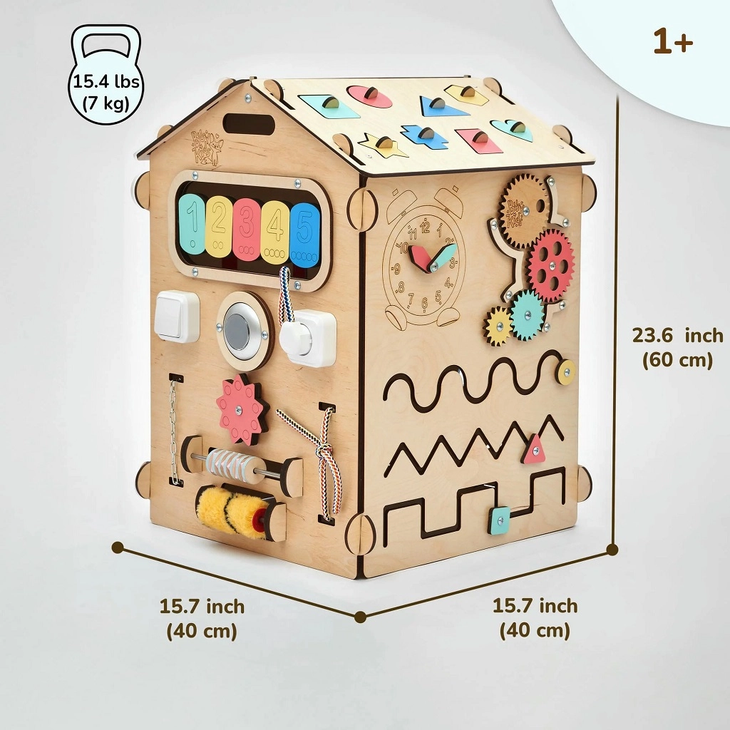 Découvrez la maison d’activités Montessori BusyKids en finition naturelle – un jouet durable, écologique et fabriqué à la main qui développe la motricité fine, la créativité et la pensée logique des enfants. Elle propose de nombreux éléments interactifs (fermetures éclair, velcro, boutons, réveil, puzzle, ardoise) et convient aux enfants à partir de 1 an. Fabriquée en contreplaqué de bouleau de qualité avec des vernis à base d’eau sûrs, sans vis, avec des assemblages rivetés et certifiée CE et EN 71.