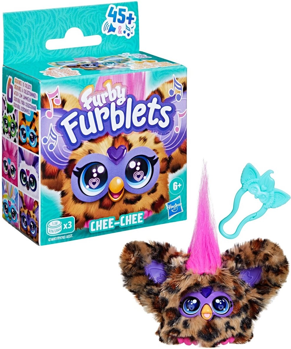Furby Furblet Chee-Chee est un petit compagnon en peluche à la grande personnalité. Il chante des mélodies originales, émet des sons amusants et, avec son style malicieux, ravit enfants et adultes. Emportez-le en voyage – le clip permet une fixation simple sur un sac à dos ou un sac à main.