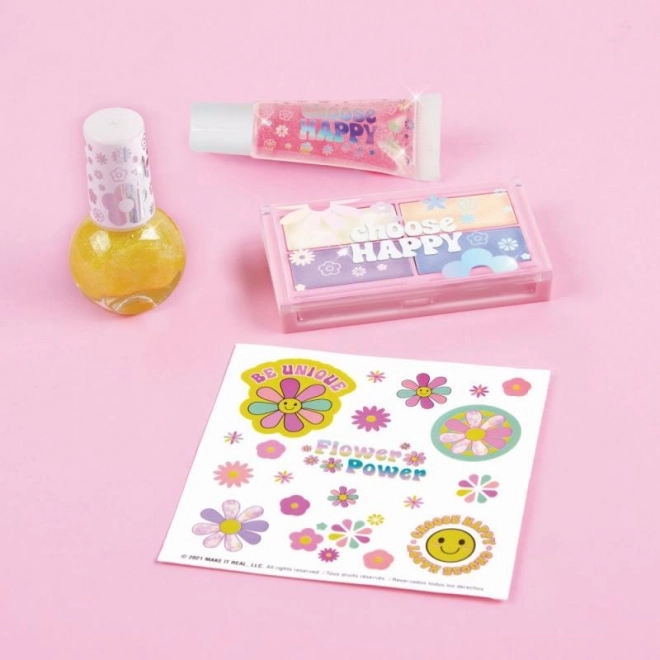 La palette de quatre couleurs de fards à paupières permet de combiner les teintes selon l’humeur, tandis que le vernis à ongles et le gloss apportent une touche de charme. La planche d’autocollants élargit les possibilités de décoration et stimule la créativité.
