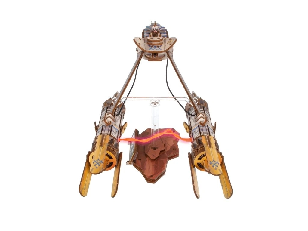 Les deux moteurs sont reliés par des conducteurs LED flexibles alimentés par des piles (non incluses), créant l’emblématique effet d’arc plasma vu lors de la Boonta Eve Classic.