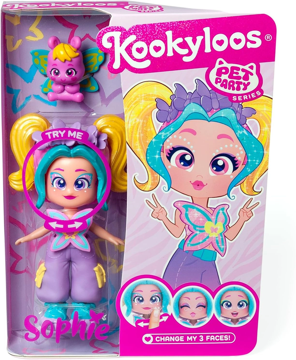 La poupée KOOKYLOOS Pet Party Sophie allie style tendance, forte personnalité et amour des animaux. La boîte contient la poupée avec une tenue stylée, une coiffure caractéristique et des accessoires assortis au thème de la fête. Un adorable petit papillon est également inclus, pour enrichir les possibilités de jeu et raconter ses propres histoires.