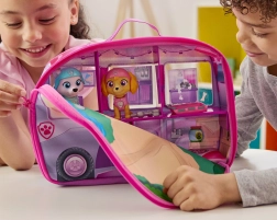 La caravane dépliable d’environ 30 cm de long se transforme, une fois ouverte, en mini-maison richement illustrée avec un tapis de parc pour le pique-nique et le repos après mission. Les enfants profiteront d’histoires inspirées de la série grâce aux figurines Skye, Liberty et Everest avec têtes oscillantes et membres articulés.