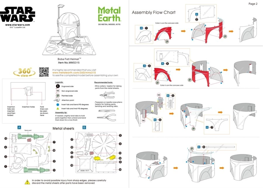 Construisez l’emblématique casque du légendaire chasseur de primes Boba Fett à partir de feuilles d’acier de haute qualité. Le modèle Metal Earth se distingue par la précision de sa fabrication et des détails réalistes grâce à la gravure laser. L’assemblage est propre et technique – les pièces se connectent au moyen de verrous, aucune colle n’est nécessaire.