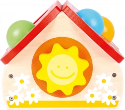 Ce jouet en bois de qualité en forme de petite maison gaie attire les enfants par ses couleurs vives et le principe simple du jeu : on insère les balles dans les ouvertures du toit, puis on les enfonce délicatement avec le marteau. Une activité ludique qui favorise la motricité, la patience et la précision.