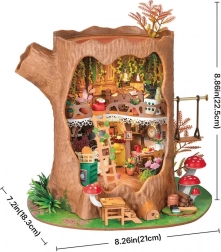 Entrez dans un monde de fantaisie et créez votre propre Maison forestière dans une souche – une mini-maison à deux niveaux avec mobilier en bois, cuisine, chambre, décorations, jardin de champignons et balançoire extérieure. Une fois les lumières LED allumées, le modèle devient une exposition enchanteresse et attire tous les regards sur l’étagère.