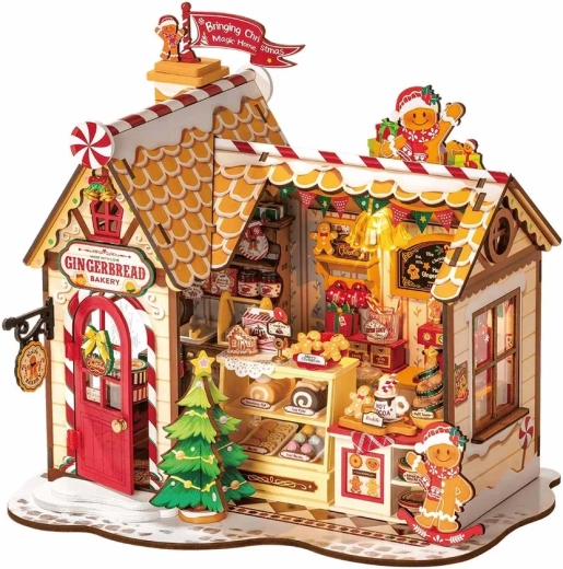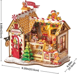 Cette maquette 3D en bois de maison en pain d’épices, richement détaillée, apporte une atmosphère festive à tout intérieur. Un toit mat orné de cannes en sucre, une porte rouge, des vitrines pleines de gourmandises et une lumière LED chaude créent une miniature unique idéale pour une étagère ou un rebord de fenêtre. Le montage ne nécessite ni colle ni outils – les pièces s’emboîtent parfaitement et le modèle final est stable.