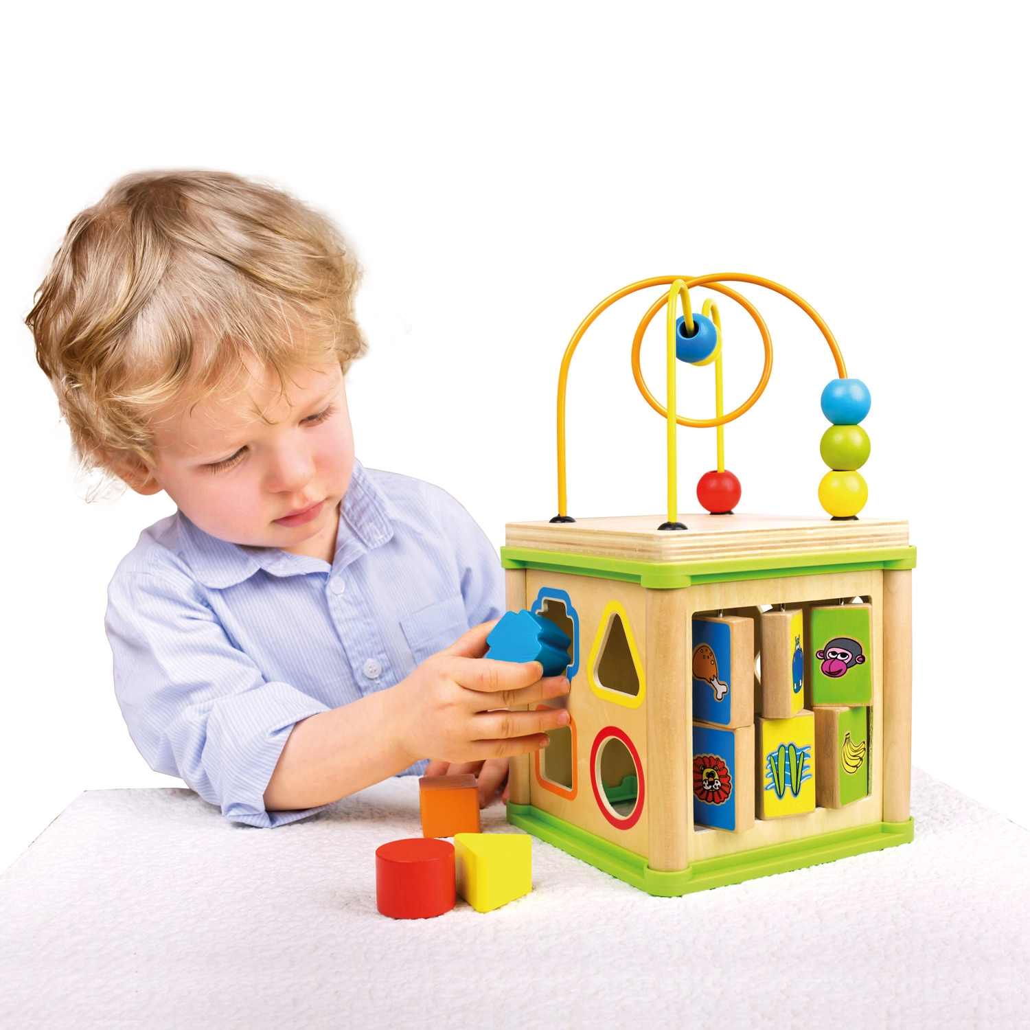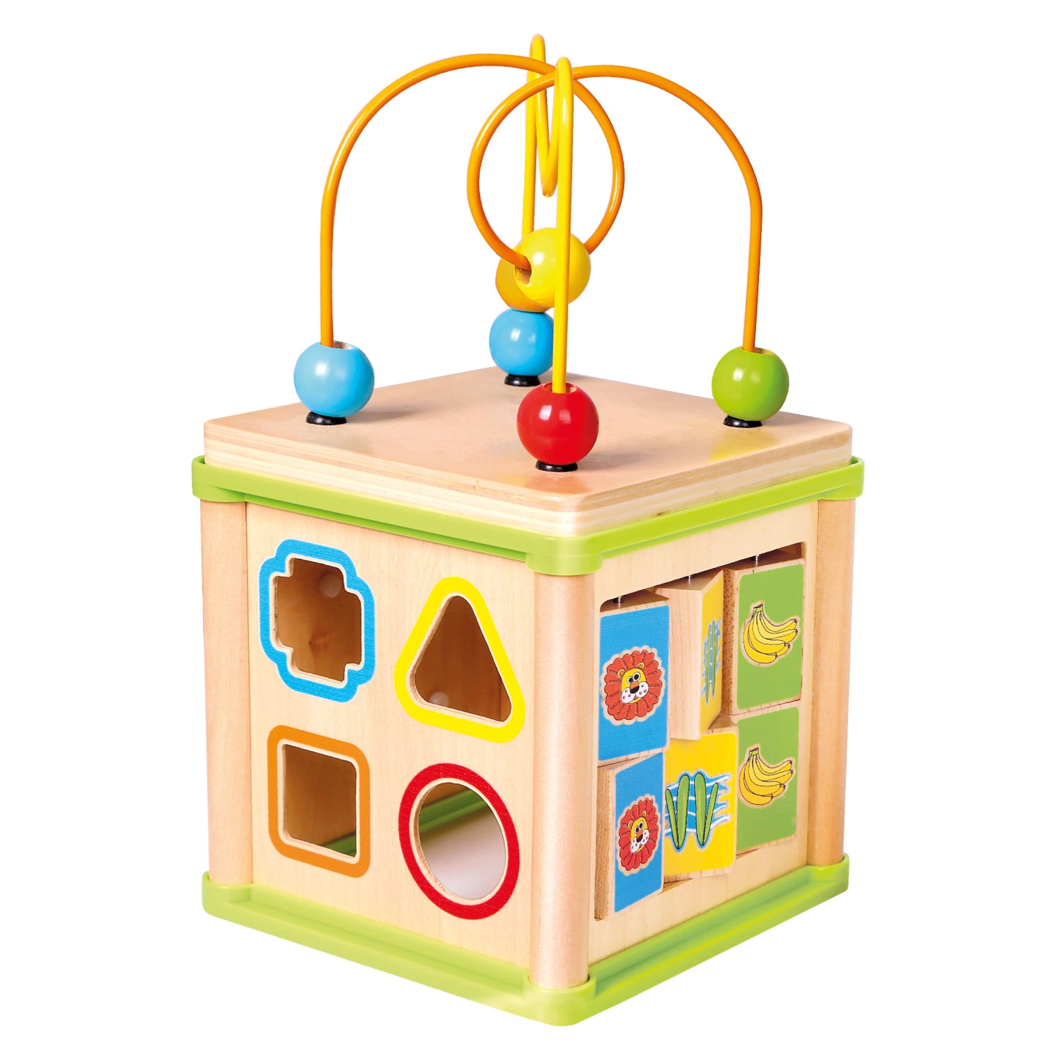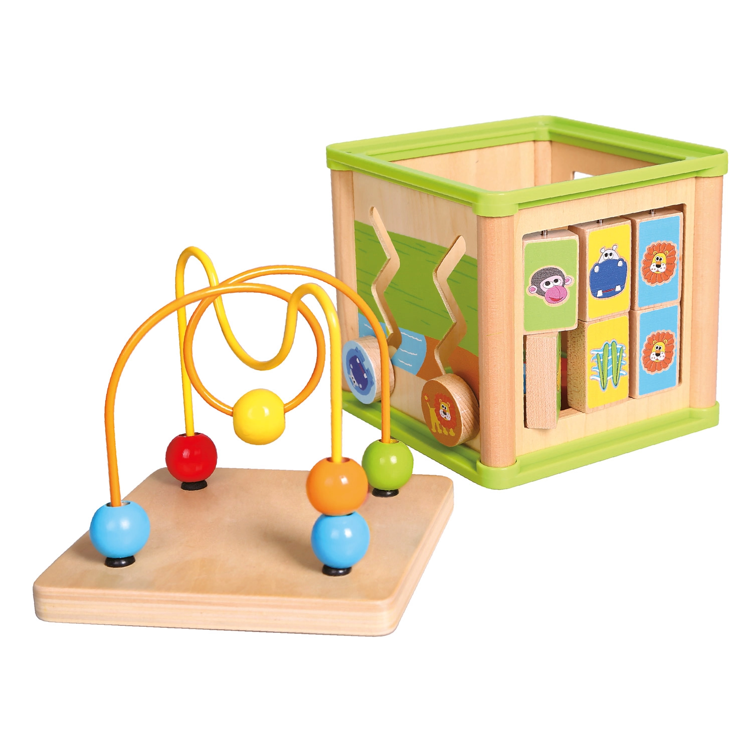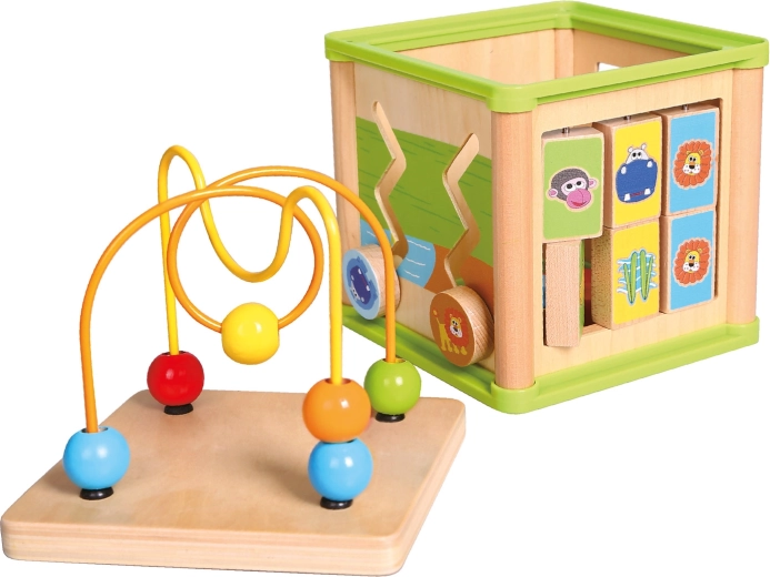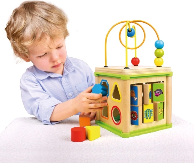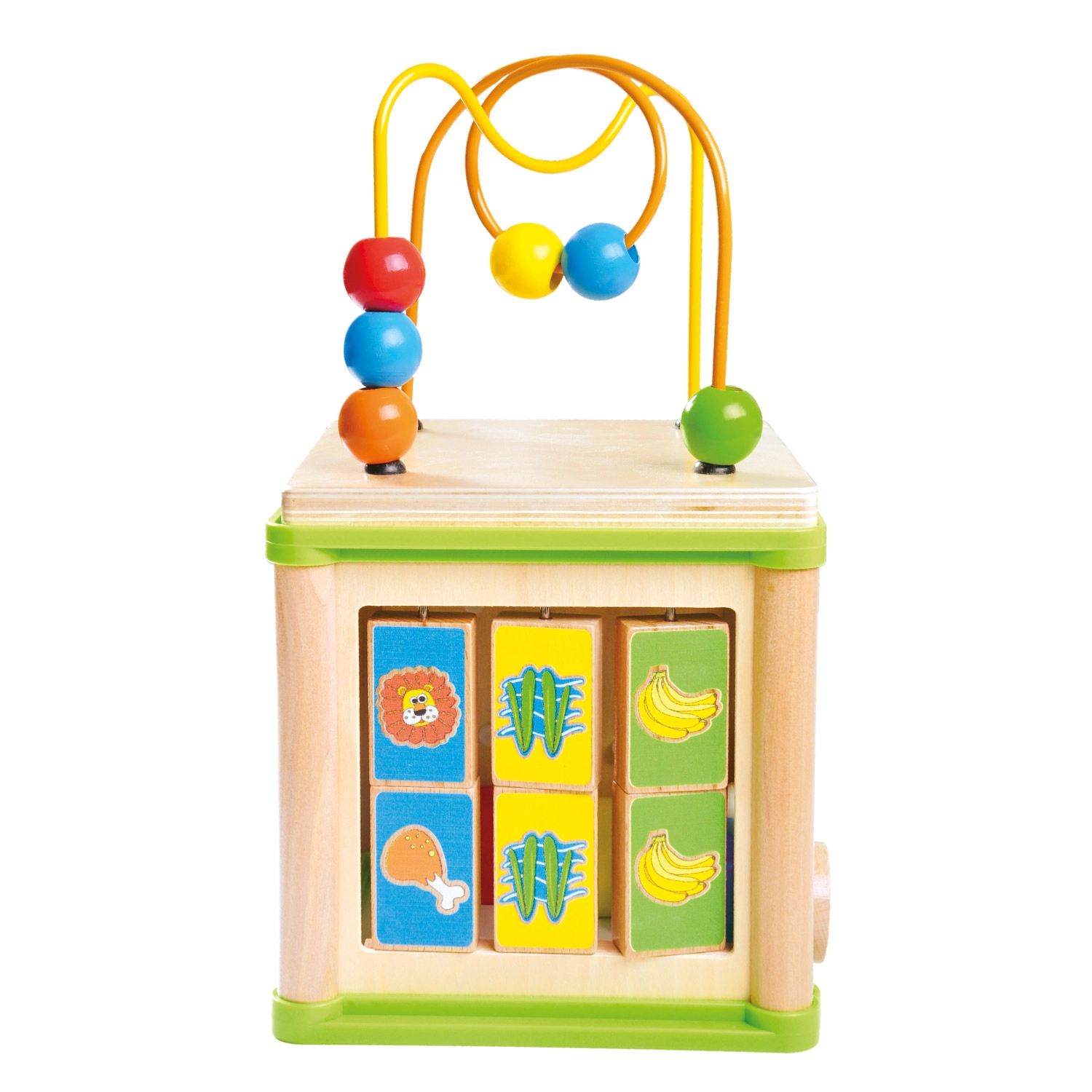 Ce cube d’activités en bois polyvalent combine cinq éléments de jeu attrayants dans un format compact. Les enfants peuvent associer les animaux à leur nourriture, faire glisser les perles le long des pistes sinueuses, explorer le fonctionnement des engrenages ou s’entraîner avec la boîte à formes. La partie supérieure est un labyrinthe de perles qui favorise la coordination œil–main et la concentration.