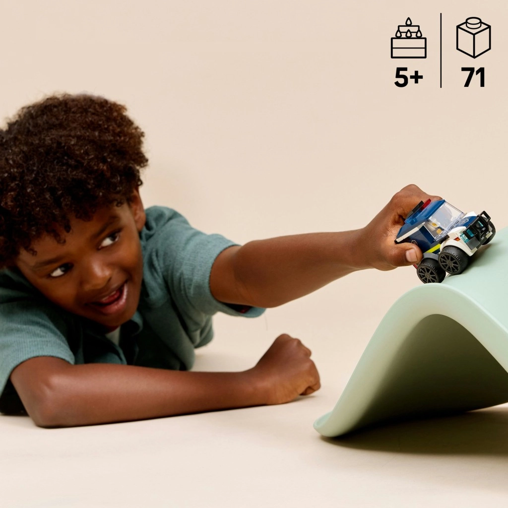Profitez de poursuites pleines d’action avec le modèle LEGO City – fourgonnette de police. Ce set de 71 pièces pour les enfants dès 5 ans offre une construction facile, une structure robuste et un look policier authentique avec de grandes roues, des feux de signalisation et une place pour une minifigurine de policier. Un excellent choix pour un jeu créatif à la maison comme en déplacement, compatible avec l’application LEGO Builder.