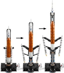 Ce set offre une combinaison impressionnante de précision technique et d’amusement. Le modèle reproduit fidèlement le décollage par étages de la fusée SLS, y compris la séparation des propulseurs d’appoint à poudre, de l’étage central et de l’étage supérieur avec module moteur et vaisseau spatial ORION. L’ensemble du mécanisme est actionné par la rotation d’une manivelle sur un socle robuste avec panneau d’information et logos NASA, ESA et programme ARTEMIS.