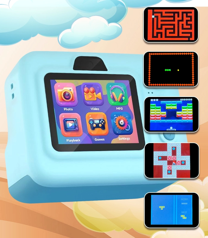 L’appareil combine prise de photos, vidéo 1080P et mini‑jeux (puzzles, serpent, flipper, sokoban) pour divertir et stimuler la créativité. Son écran 2,4" lumineux et sa commande intuitive facilitent la consultation et la gestion des photos et vidéos par les enfants. La prise en charge des cartes mémoire microSD jusqu’à 32 Go offre suffisamment d’espace pour les souvenirs.